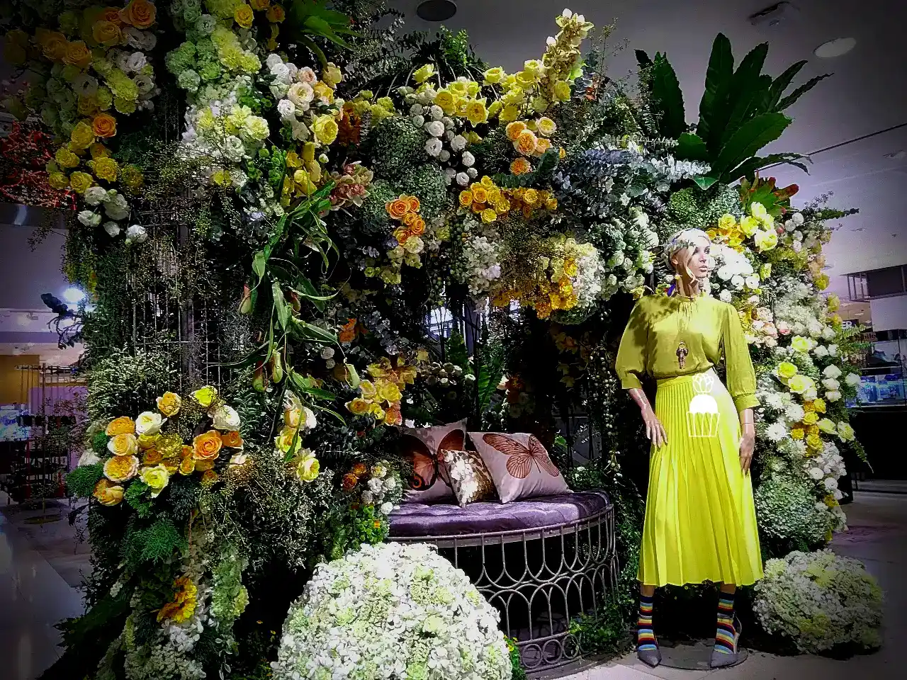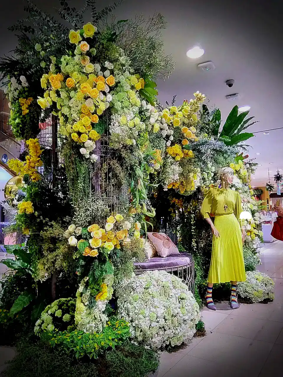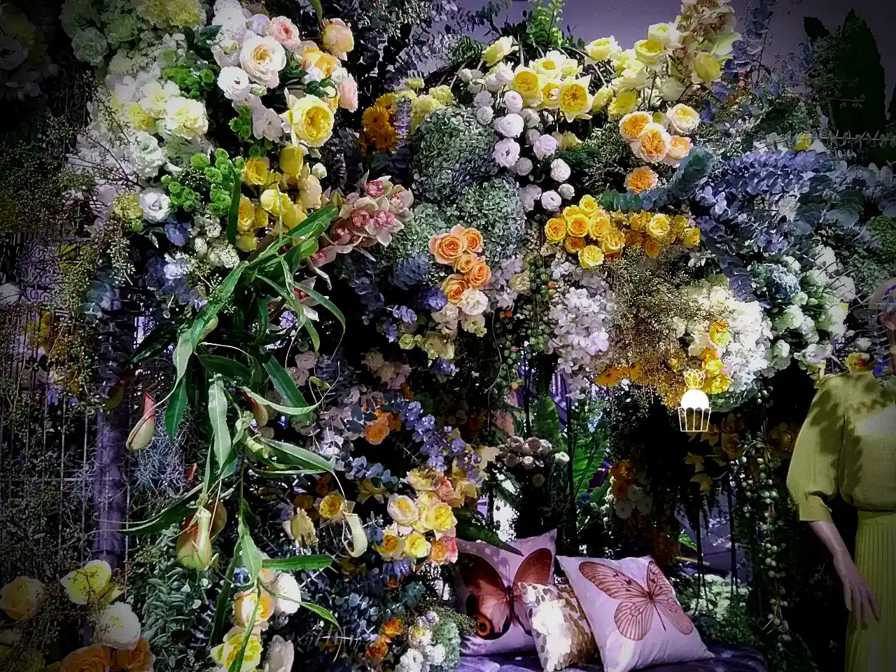 ความโดดเด่นของการจัดดอกไม้ชุดนี้คือการใช้โครงสร้างเป็น กาซิโบ้ (Gazebo) ขนาดเล็ก ทำจากโครงเหล็ก ดัดโค้งกาจัดด้วยดอกกุหลาบหลายสายพันธุ์ และดอกที่มีอีกหลายๆชนิดรวมกัน เกาะอยู่ตามโครงสร้าง ให้ดูเป็นธรรมชาติสร้างมากที่สุด ความละเอียดอ่อนเป็นองค์ประกอบหลัก จัดเรียงสลับไปมาระหว่างดอกไม้สีเหลืองและขาว สร้างความสมดุลที่สวยงามและลงตัว นอกจากนี้ ยังมีการใช้ใบไม้และดอกไม้ชนิดอื่น ๆ เพื่อเพิ่มมิติความลึก ทำให้การจัดดอกไม้ดูมีความโดดเด่นและน่าประทับใจยิ่งขึ้น