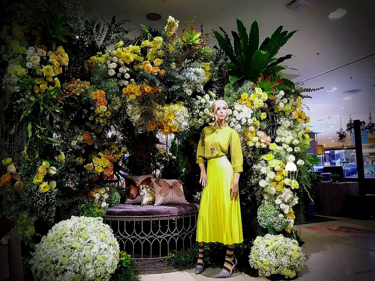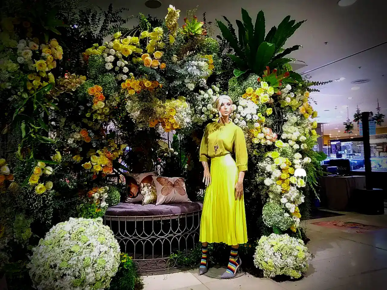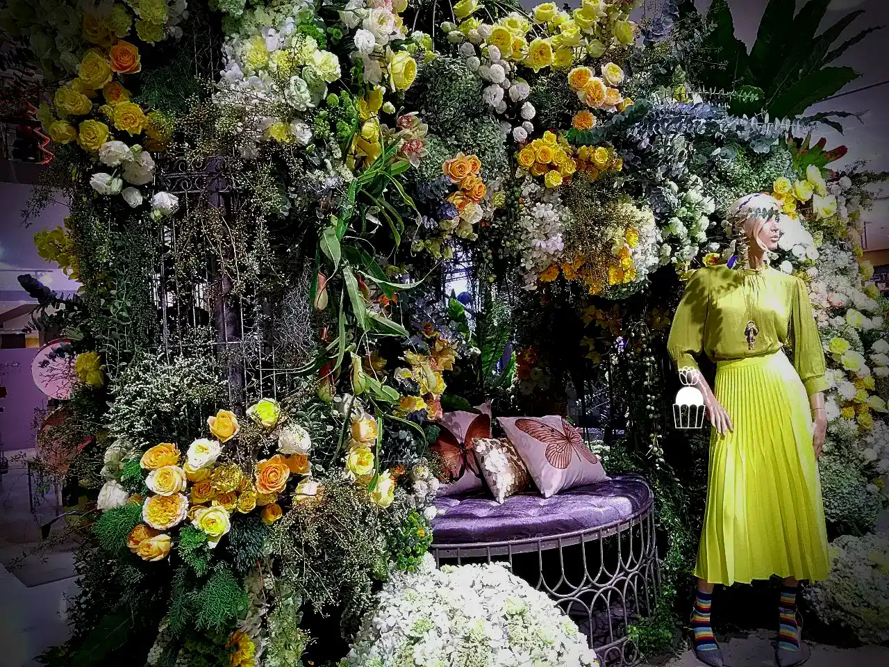 ความโดดเด่นของการจัดดอกไม้ชุดนี้คือการใช้โครงสร้างเป็น กาซิโบ้ (Gazebo) ขนาดเล็ก ทำจากโครงเหล็ก ดัดโค้งกาจัดด้วยดอกกุหลาบหลายสายพันธุ์ และดอกที่มีอีกหลายๆชนิดรวมกัน เกาะอยู่ตามโครงสร้าง ให้ดูเป็นธรรมชาติสร้างมากที่สุด ความละเอียดอ่อนเป็นองค์ประกอบหลัก จัดเรียงสลับไปมาระหว่างดอกไม้สีเหลืองและขาว สร้างความสมดุลที่สวยงามและลงตัว นอกจากนี้ ยังมีการใช้ใบไม้และดอกไม้ชนิดอื่น ๆ เพื่อเพิ่มมิติความลึก ทำให้การจัดดอกไม้ดูมีความโดดเด่นและน่าประทับใจยิ่งขึ้น