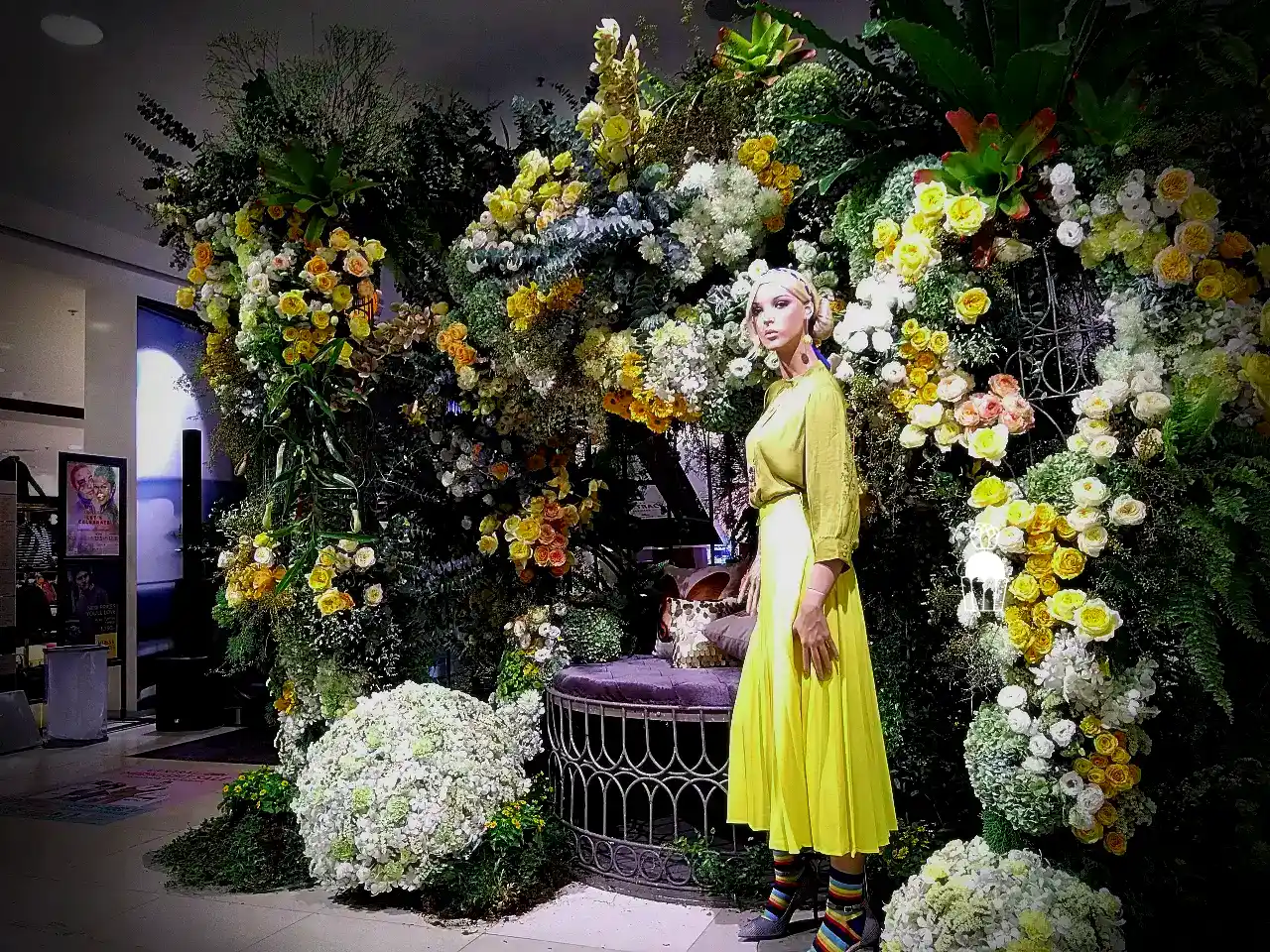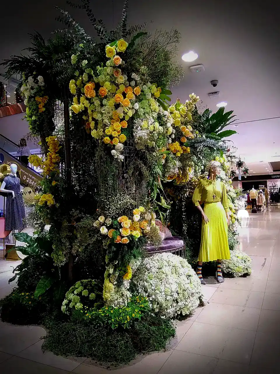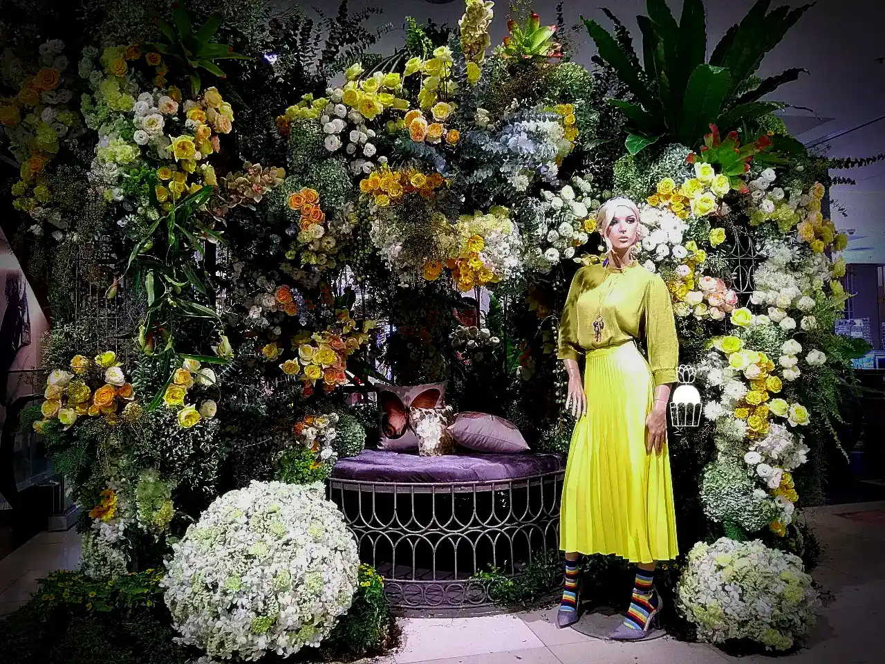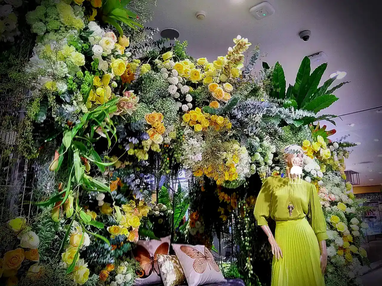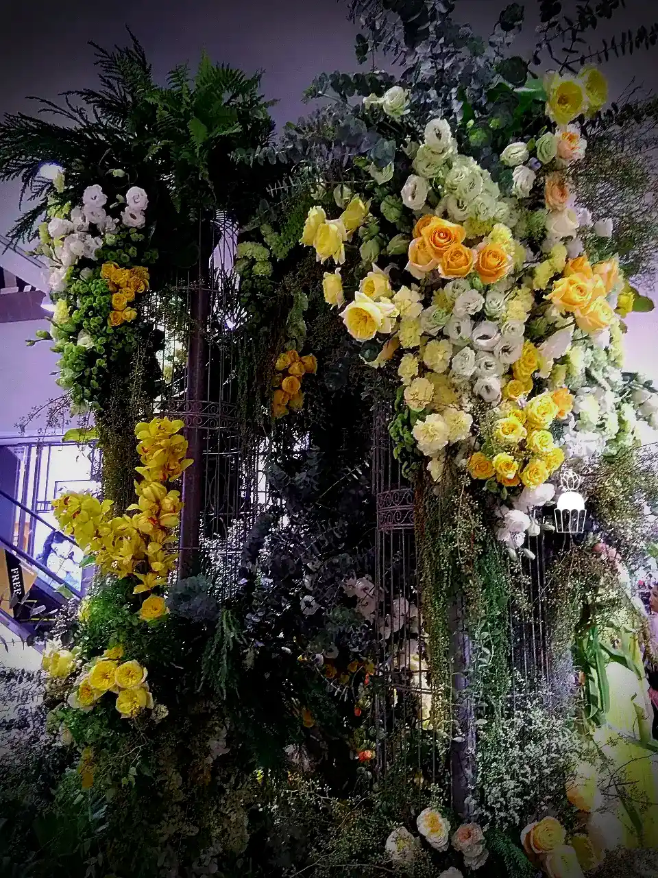 ความโดดเด่นของการจัดดอกไม้ชุดนี้คือการใช้โครงสร้างเป็น กาซิโบ้ (Gazebo) ขนาดเล็ก ทำจากโครงเหล็ก ดัดโค้งกาจัดด้วยดอกกุหลาบหลายสายพันธุ์ และดอกที่มีอีกหลายๆชนิดรวมกัน เกาะอยู่ตามโครงสร้าง ให้ดูเป็นธรรมชาติสร้างมากที่สุด ความละเอียดอ่อนเป็นองค์ประกอบหลัก จัดเรียงสลับไปมาระหว่างดอกไม้สีเหลืองและขาว สร้างความสมดุลที่สวยงามและลงตัว นอกจากนี้ ยังมีการใช้ใบไม้และดอกไม้ชนิดอื่น ๆ เพื่อเพิ่มมิติความลึก ทำให้การจัดดอกไม้ดูมีความโดดเด่นและน่าประทับใจยิ่งขึ้น