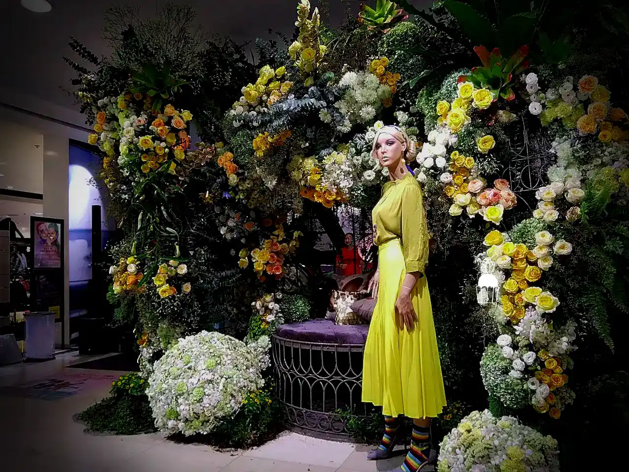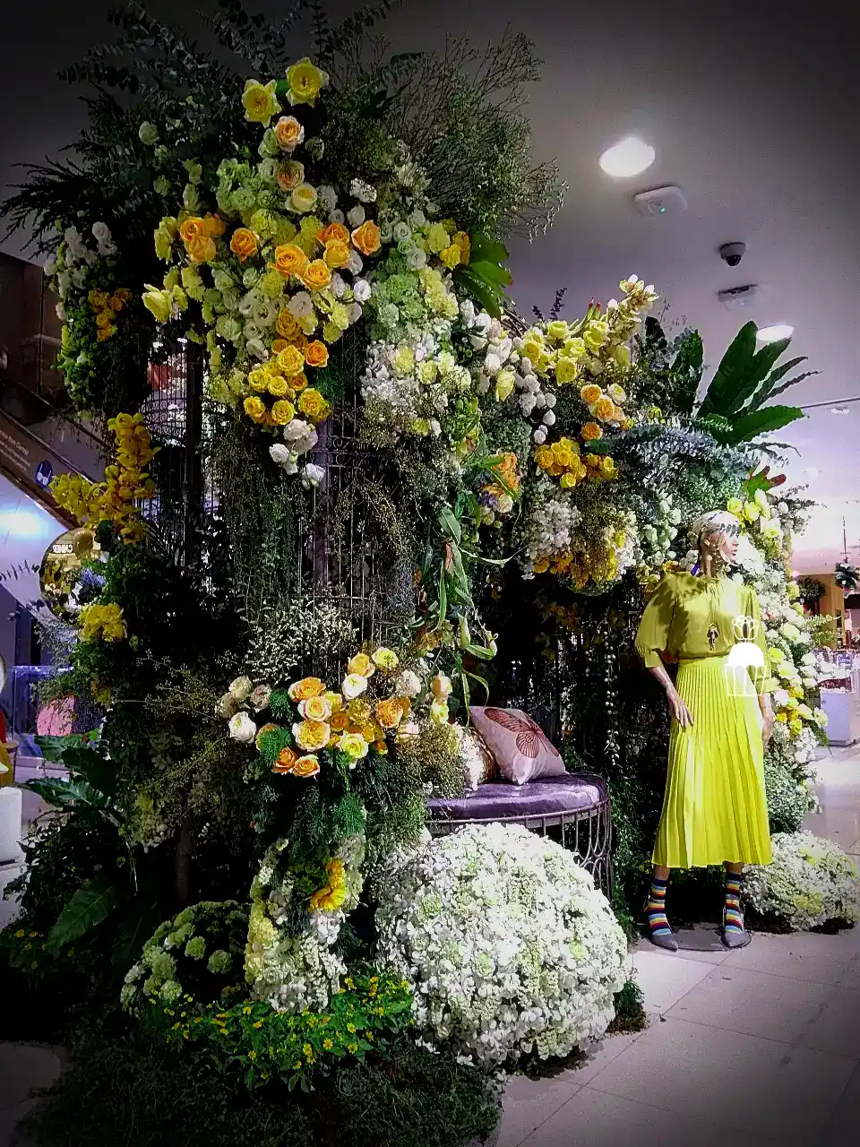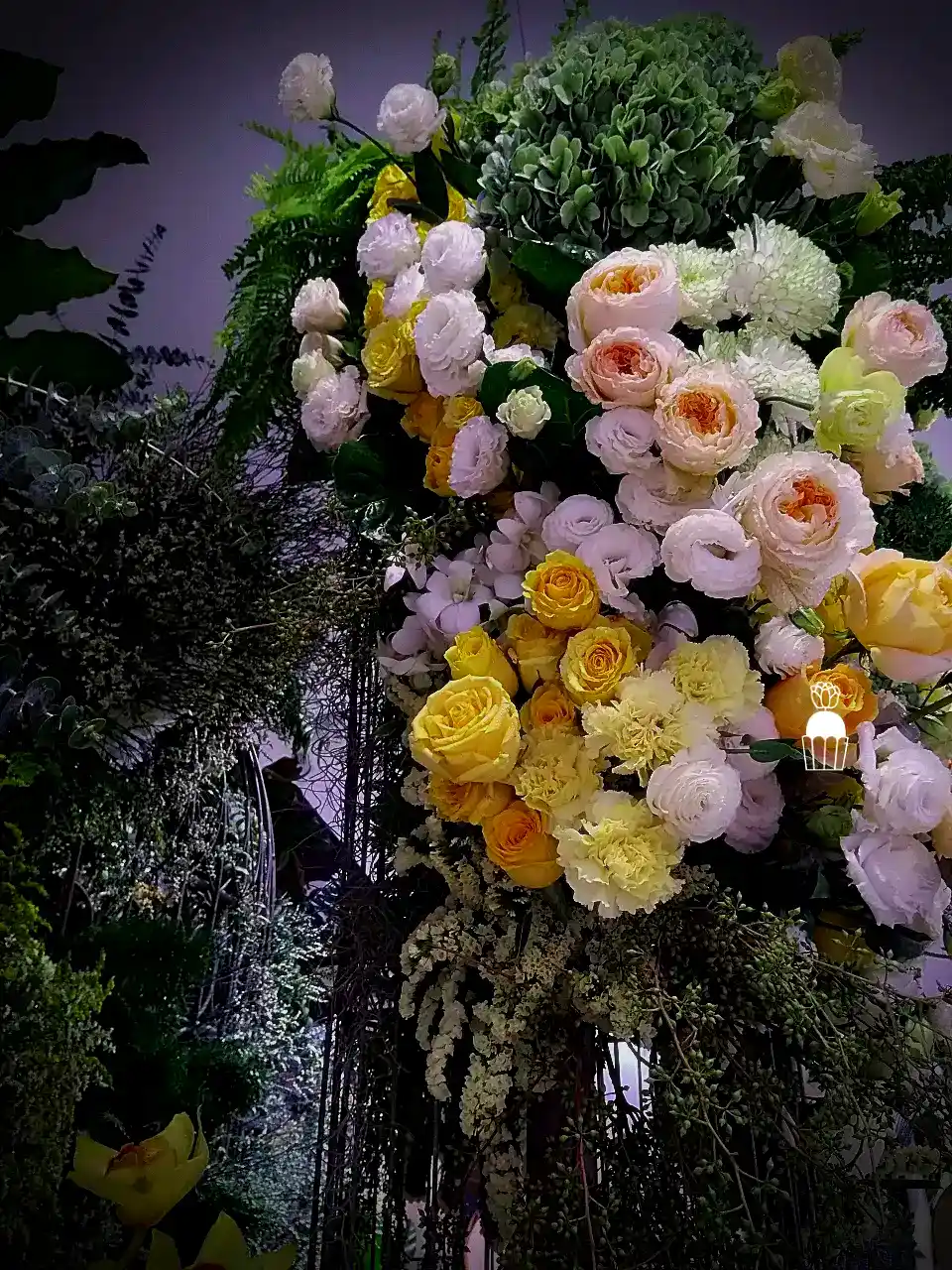 ความโดดเด่นของการจัดดอกไม้ชุดนี้คือการใช้โครงสร้างเป็น กาซิโบ้ (Gazebo) ขนาดเล็ก ทำจากโครงเหล็ก ดัดโค้งกาจัดด้วยดอกกุหลาบหลายสายพันธุ์ และดอกที่มีอีกหลายๆชนิดรวมกัน เกาะอยู่ตามโครงสร้าง ให้ดูเป็นธรรมชาติสร้างมากที่สุด ความละเอียดอ่อนเป็นองค์ประกอบหลัก จัดเรียงสลับไปมาระหว่างดอกไม้สีเหลืองและขาว สร้างความสมดุลที่สวยงามและลงตัว นอกจากนี้ ยังมีการใช้ใบไม้และดอกไม้ชนิดอื่น ๆ เพื่อเพิ่มมิติความลึก ทำให้การจัดดอกไม้ดูมีความโดดเด่นและน่าประทับใจยิ่งขึ้น