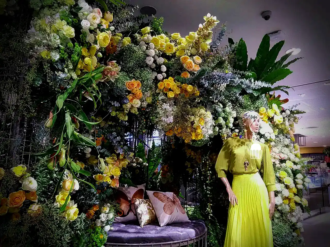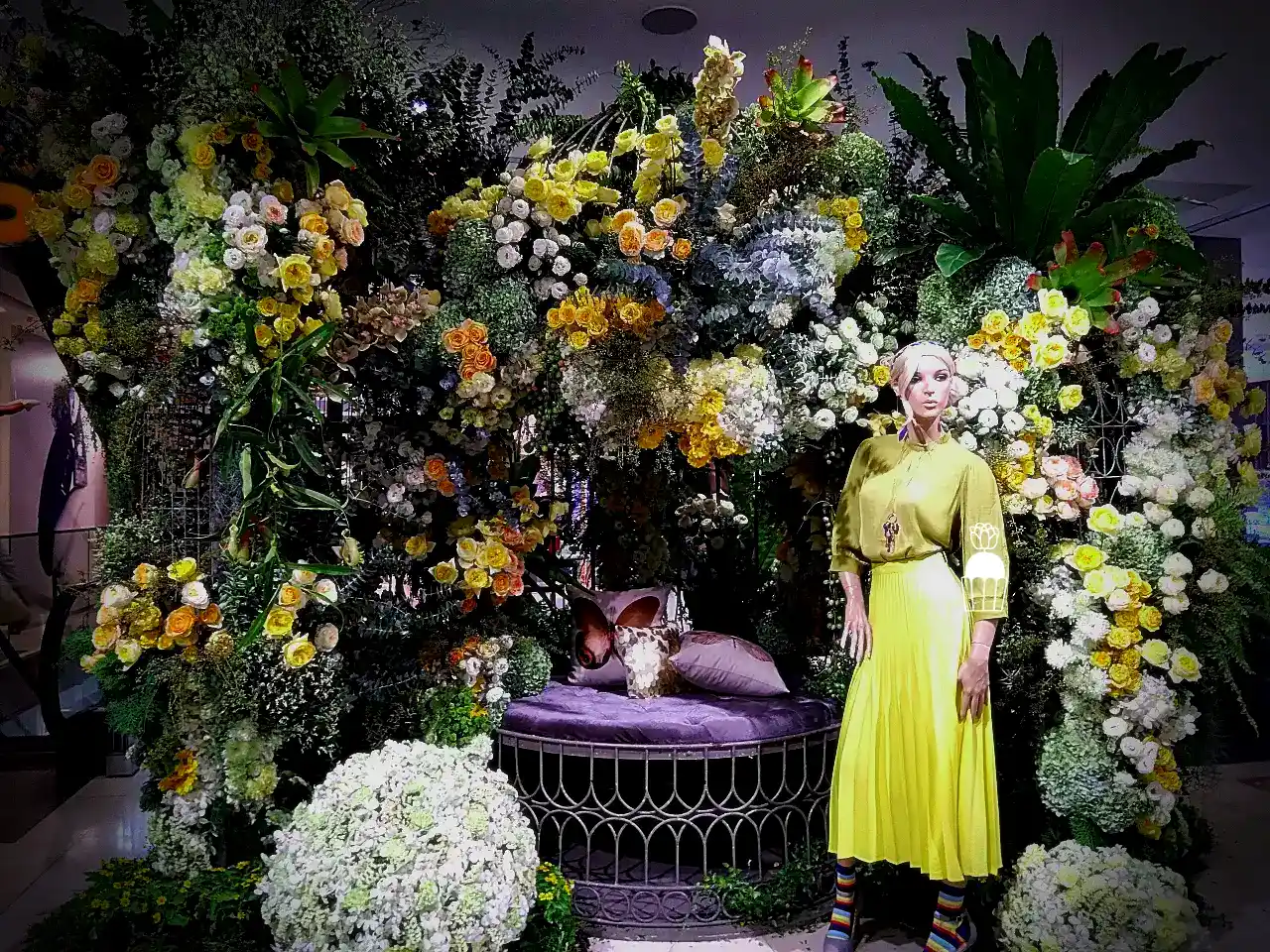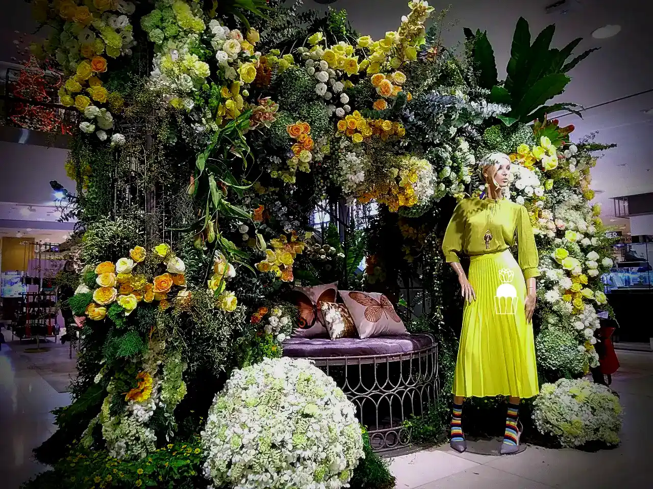 ความโดดเด่นของการจัดดอกไม้ชุดนี้คือการใช้โครงสร้างเป็น กาซิโบ้ (Gazebo) ขนาดเล็ก ทำจากโครงเหล็ก ดัดโค้งกาจัดด้วยดอกกุหลาบหลายสายพันธุ์ และดอกที่มีอีกหลายๆชนิดรวมกัน เกาะอยู่ตามโครงสร้าง ให้ดูเป็นธรรมชาติสร้างมากที่สุด ความละเอียดอ่อนเป็นองค์ประกอบหลัก จัดเรียงสลับไปมาระหว่างดอกไม้สีเหลืองและขาว สร้างความสมดุลที่สวยงามและลงตัว นอกจากนี้ ยังมีการใช้ใบไม้และดอกไม้ชนิดอื่น ๆ เพื่อเพิ่มมิติความลึก ทำให้การจัดดอกไม้ดูมีความโดดเด่นและน่าประทับใจยิ่งขึ้น