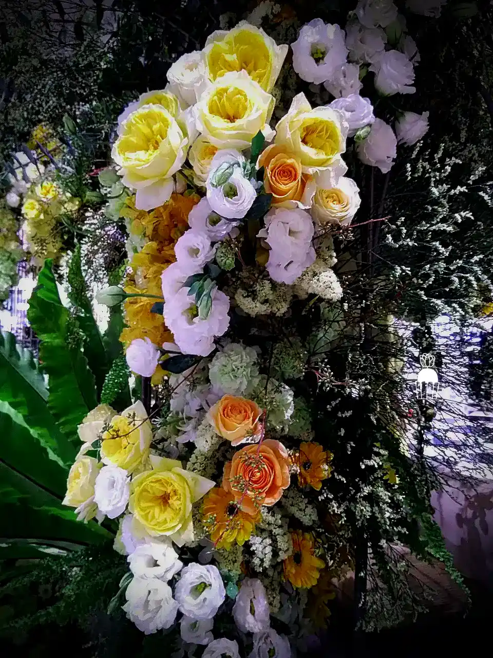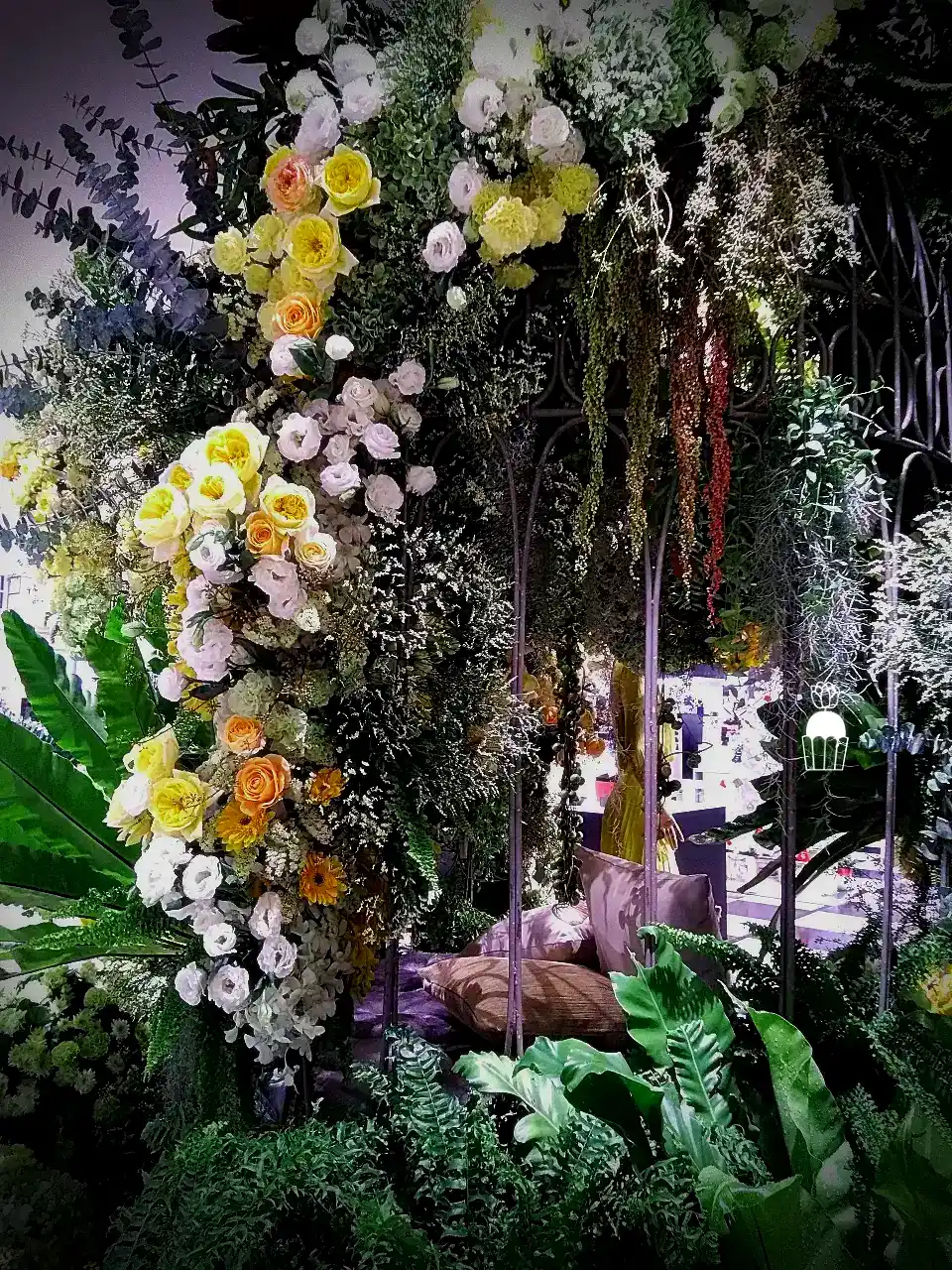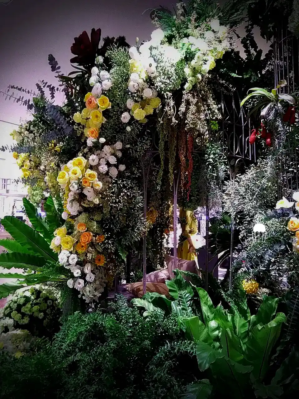 ความโดดเด่นของการจัดดอกไม้ชุดนี้คือการใช้โครงสร้างเป็น กาซิโบ้ (Gazebo) ขนาดเล็ก ทำจากโครงเหล็ก ดัดโค้งกาจัดด้วยดอกกุหลาบหลายสายพันธุ์ และดอกที่มีอีกหลายๆชนิดรวมกัน เกาะอยู่ตามโครงสร้าง ให้ดูเป็นธรรมชาติสร้างมากที่สุด ความละเอียดอ่อนเป็นองค์ประกอบหลัก จัดเรียงสลับไปมาระหว่างดอกไม้สีเหลืองและขาว สร้างความสมดุลที่สวยงามและลงตัว นอกจากนี้ ยังมีการใช้ใบไม้และดอกไม้ชนิดอื่น ๆ เพื่อเพิ่มมิติความลึก ทำให้การจัดดอกไม้ดูมีความโดดเด่นและน่าประทับใจยิ่งขึ้น