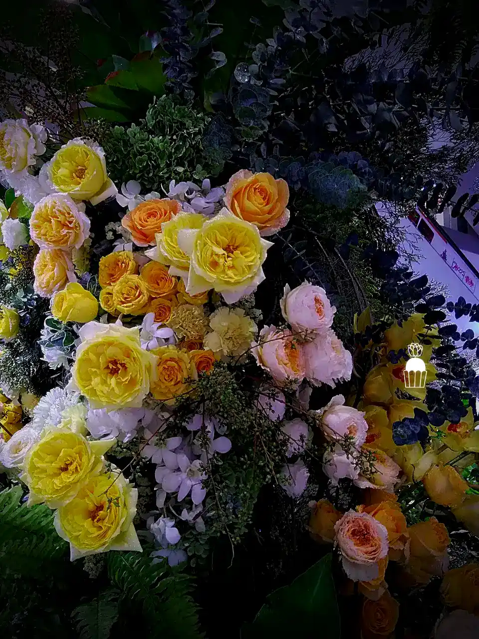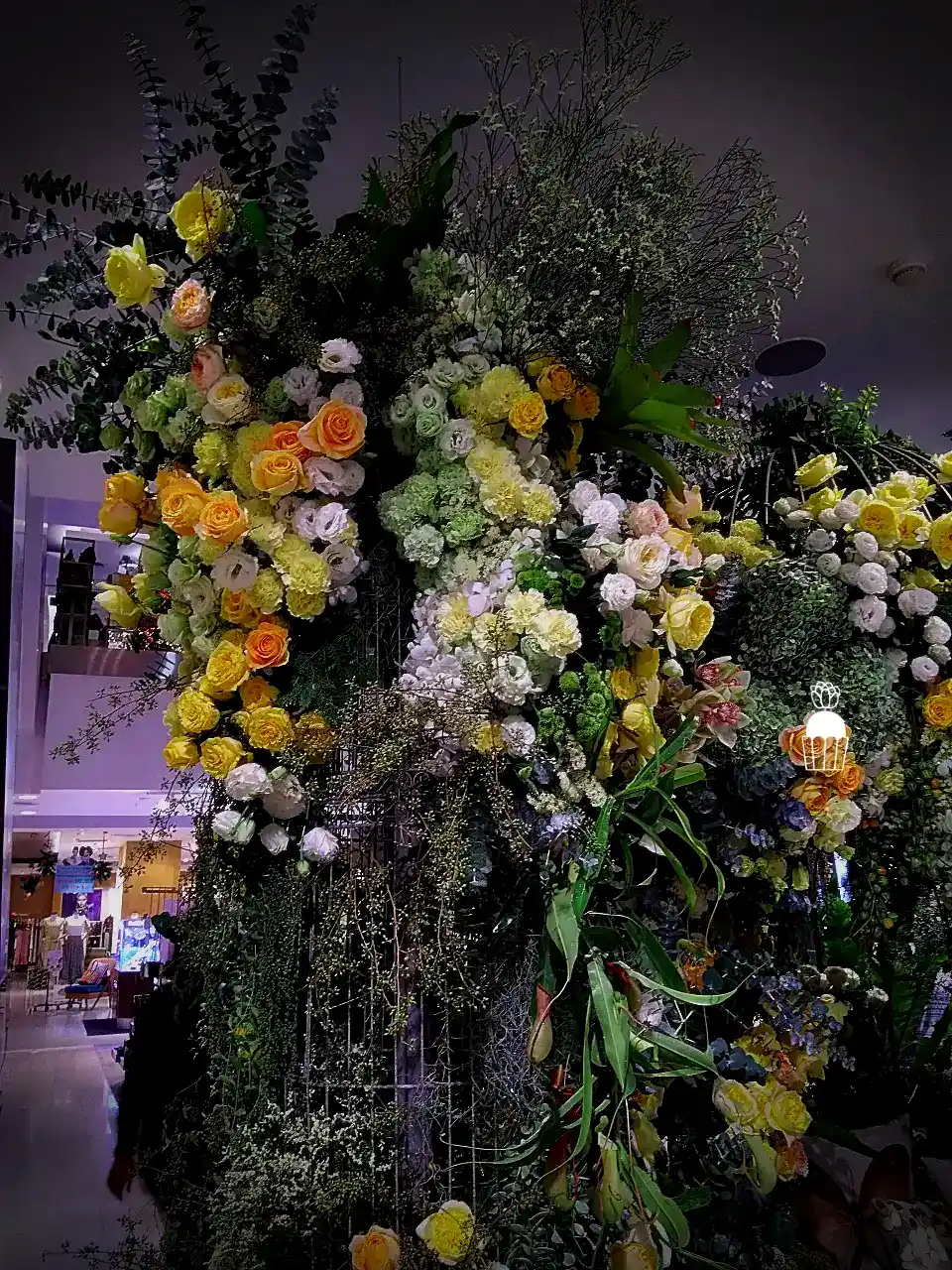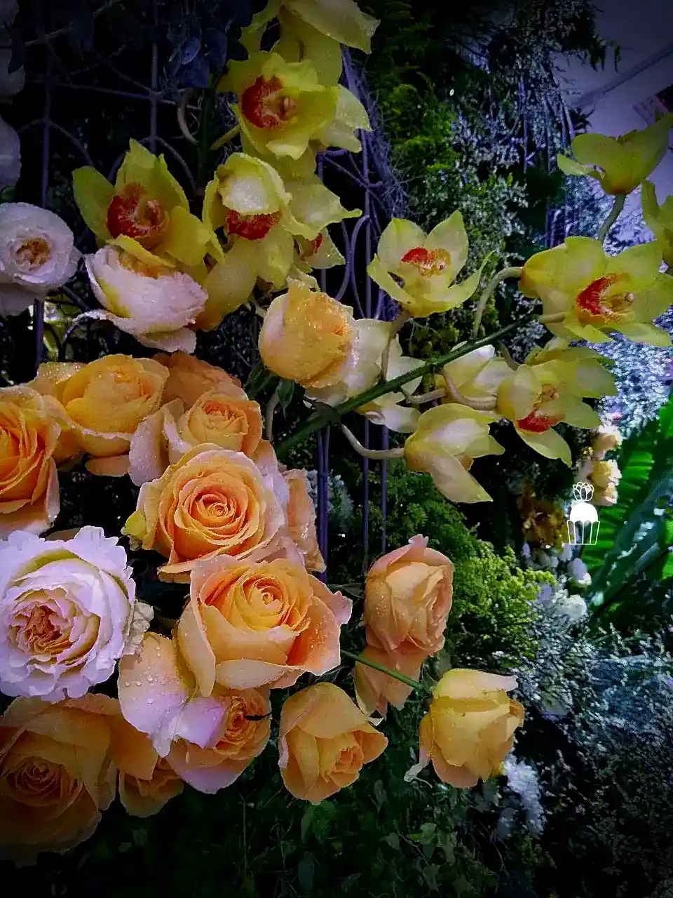 ความโดดเด่นของการจัดดอกไม้ชุดนี้คือการใช้โครงสร้างเป็น กาซิโบ้ (Gazebo) ขนาดเล็ก ทำจากโครงเหล็ก ดัดโค้งกาจัดด้วยดอกกุหลาบหลายสายพันธุ์ และดอกที่มีอีกหลายๆชนิดรวมกัน เกาะอยู่ตามโครงสร้าง ให้ดูเป็นธรรมชาติสร้างมากที่สุด ความละเอียดอ่อนเป็นองค์ประกอบหลัก จัดเรียงสลับไปมาระหว่างดอกไม้สีเหลืองและขาว สร้างความสมดุลที่สวยงามและลงตัว นอกจากนี้ ยังมีการใช้ใบไม้และดอกไม้ชนิดอื่น ๆ เพื่อเพิ่มมิติความลึก ทำให้การจัดดอกไม้ดูมีความโดดเด่นและน่าประทับใจยิ่งขึ้น