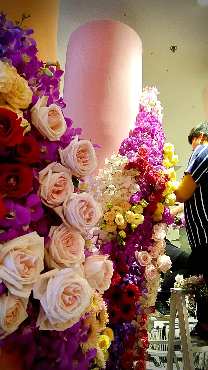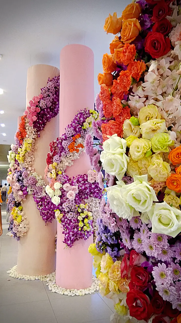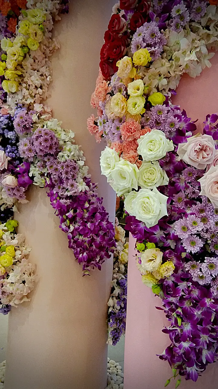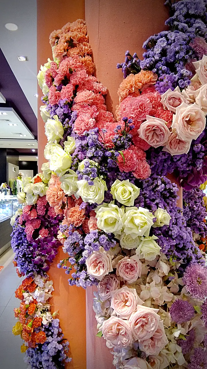 การจัดดอกไม้แนวตั้งที่สวยงาม โดดเด่นด้วยการไล่สีจากดอกไม้หลากชนิด ตั้งแต่สีม่วงอ่อน สีชมพู ไปจนถึงสีส้มและสีเหลือง ตกแต่งบนเสาโทนสีอ่อน พร้อมเก้าอี้สไตล์โมเดิร์นสีขาวและหมอนอิงสีส้ม เพิ่มบรรยากาศอบอุ่นและหรูหรา.