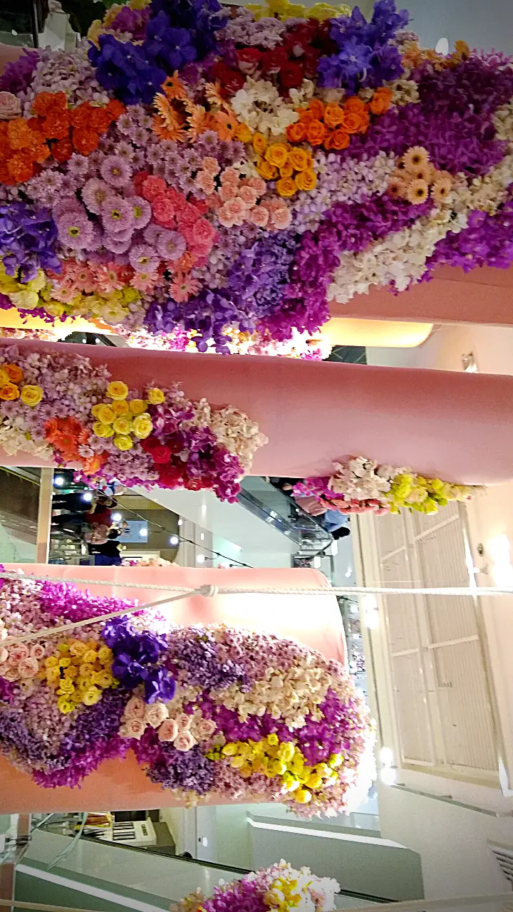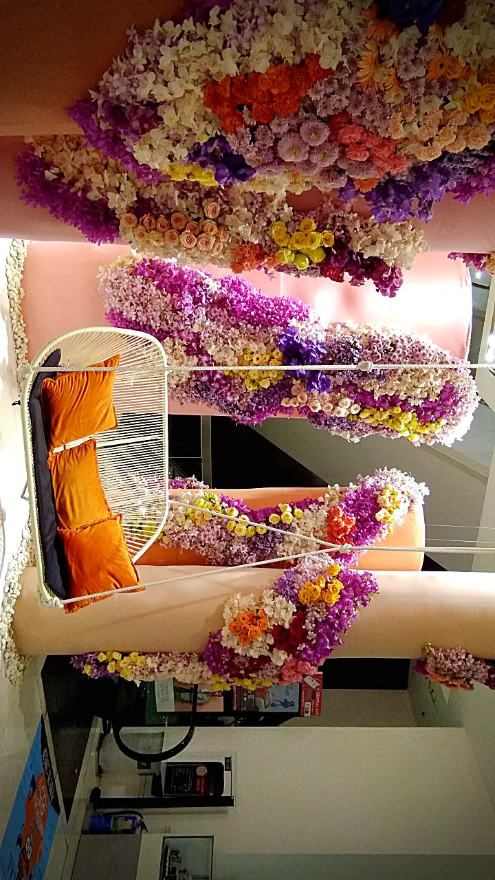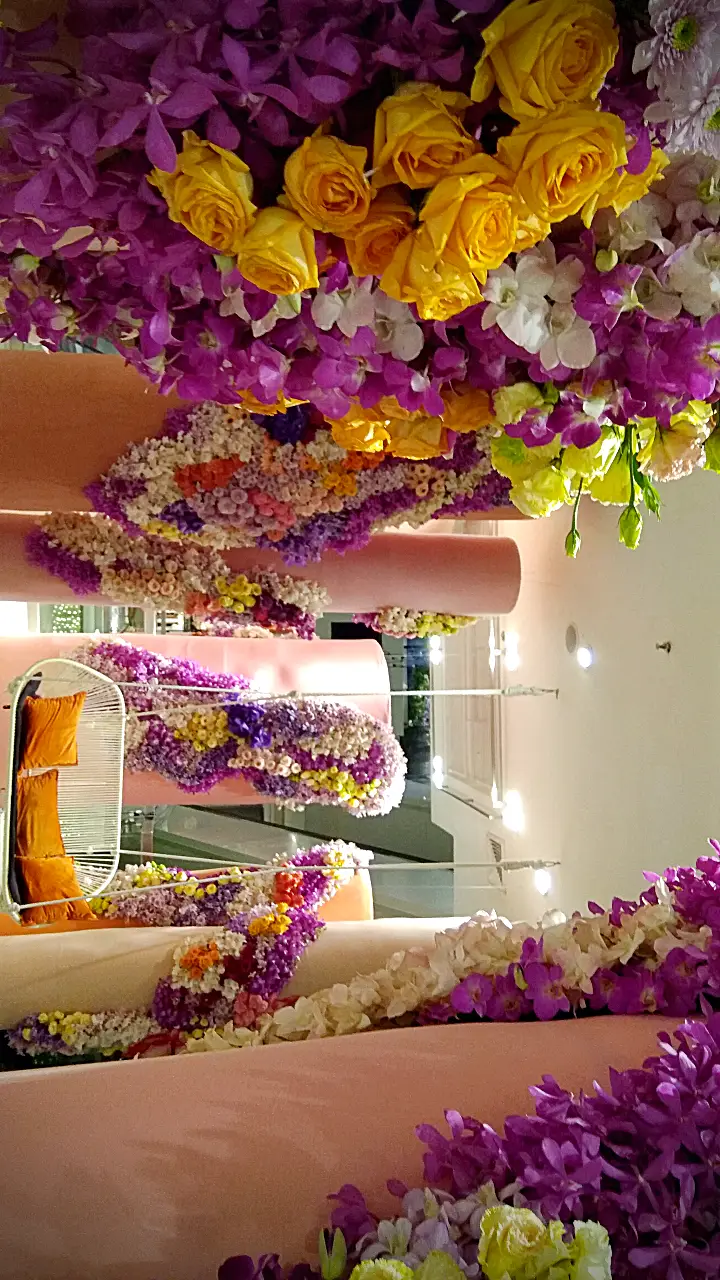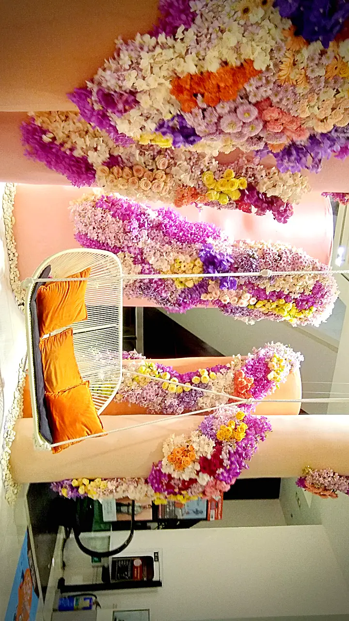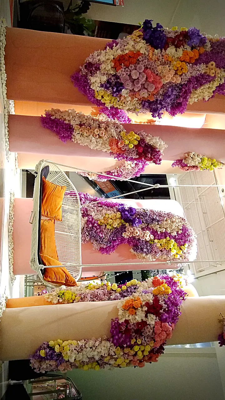 การจัดดอกไม้แนวตั้งที่สวยงาม โดดเด่นด้วยการไล่สีจากดอกไม้หลากชนิด ตั้งแต่สีม่วงอ่อน สีชมพู ไปจนถึงสีส้มและสีเหลือง ตกแต่งบนเสาโทนสีอ่อน พร้อมเก้าอี้สไตล์โมเดิร์นสีขาวและหมอนอิงสีส้ม เพิ่มบรรยากาศอบอุ่นและหรูหรา.