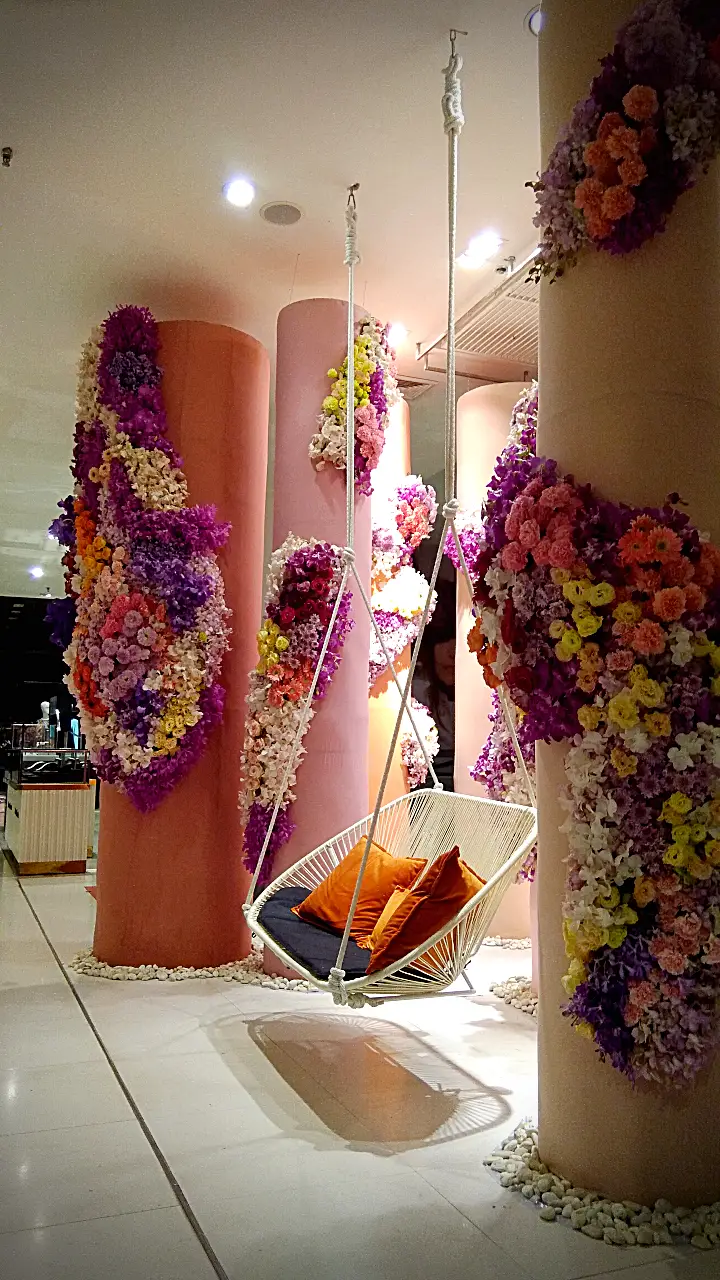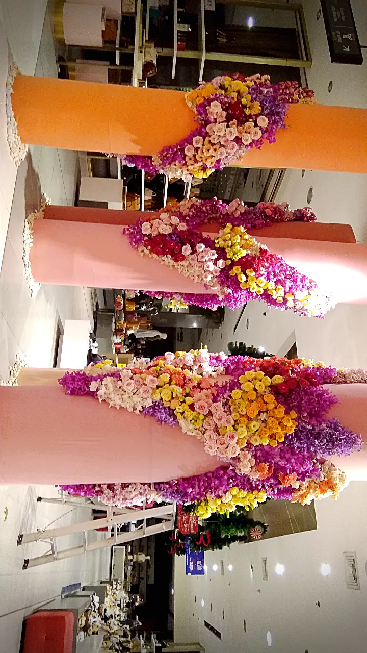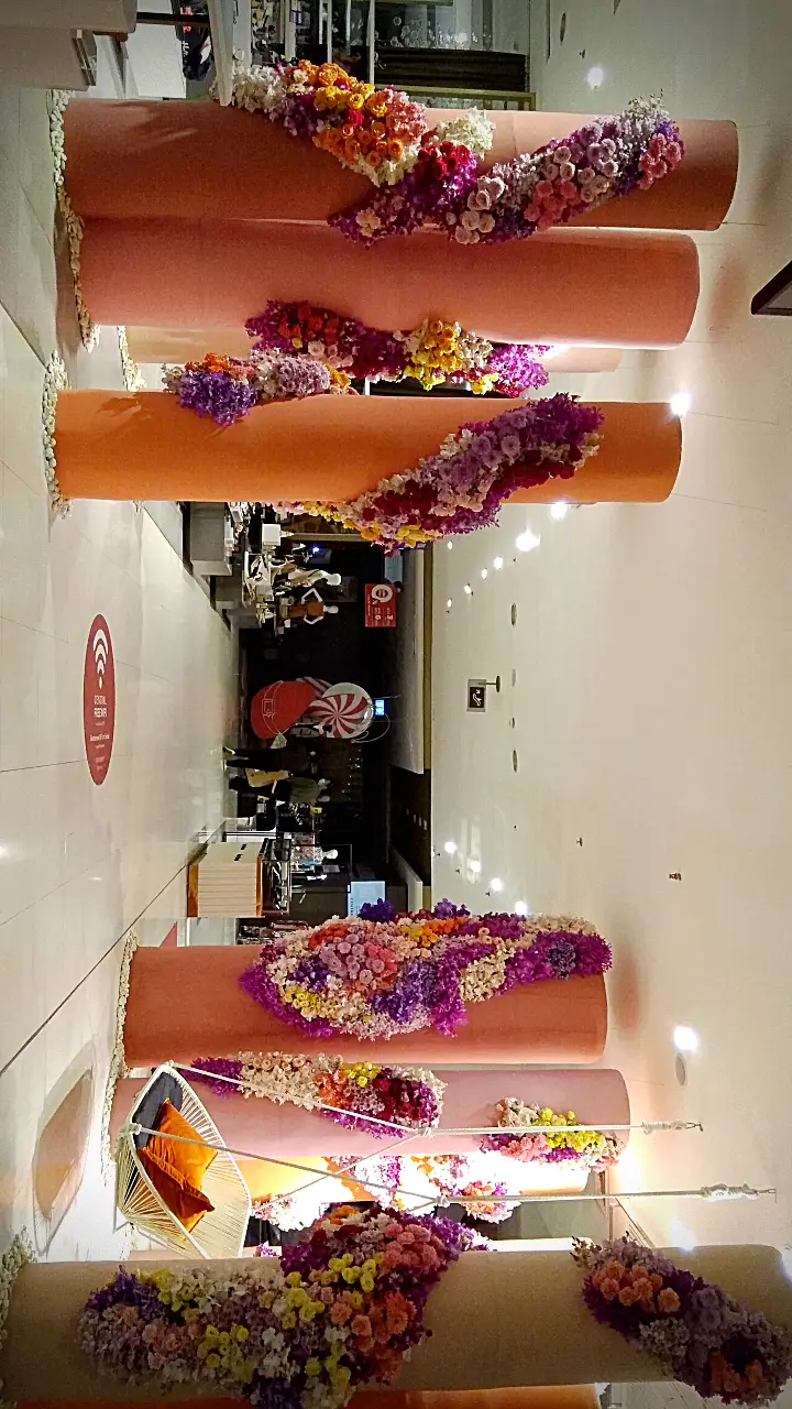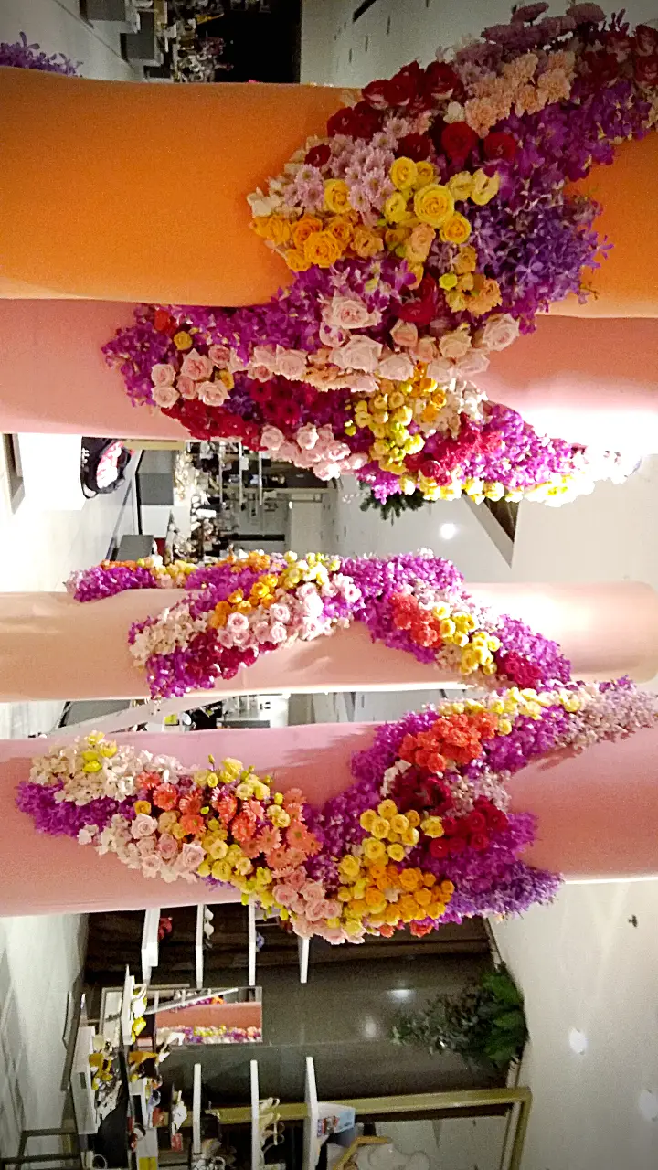 การจัดดอกไม้แนวตั้งที่สวยงาม โดดเด่นด้วยการไล่สีจากดอกไม้หลากชนิด ตั้งแต่สีม่วงอ่อน สีชมพู ไปจนถึงสีส้มและสีเหลือง ตกแต่งบนเสาโทนสีอ่อน พร้อมเก้าอี้สไตล์โมเดิร์นสีขาวและหมอนอิงสีส้ม เพิ่มบรรยากาศอบอุ่นและหรูหรา.