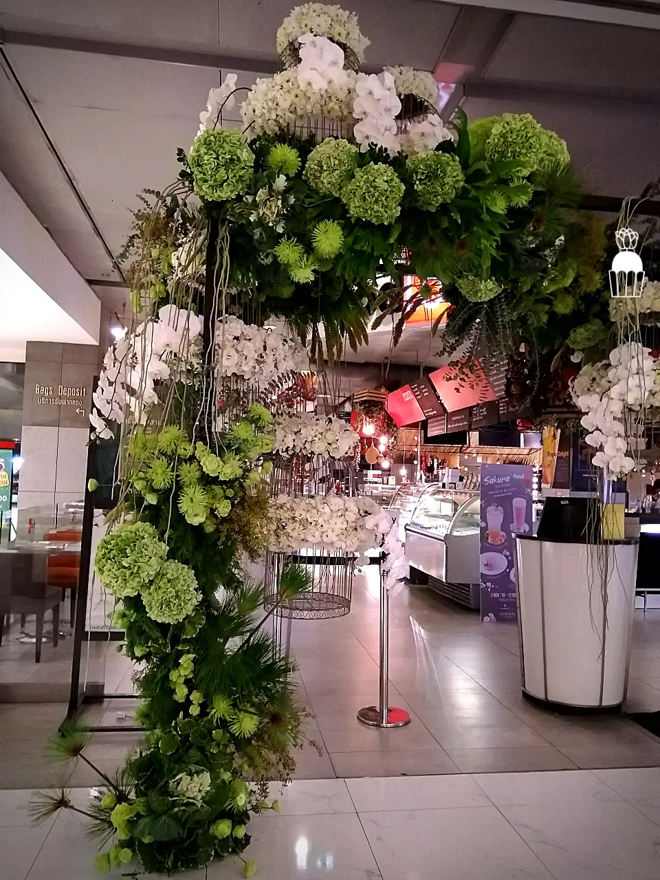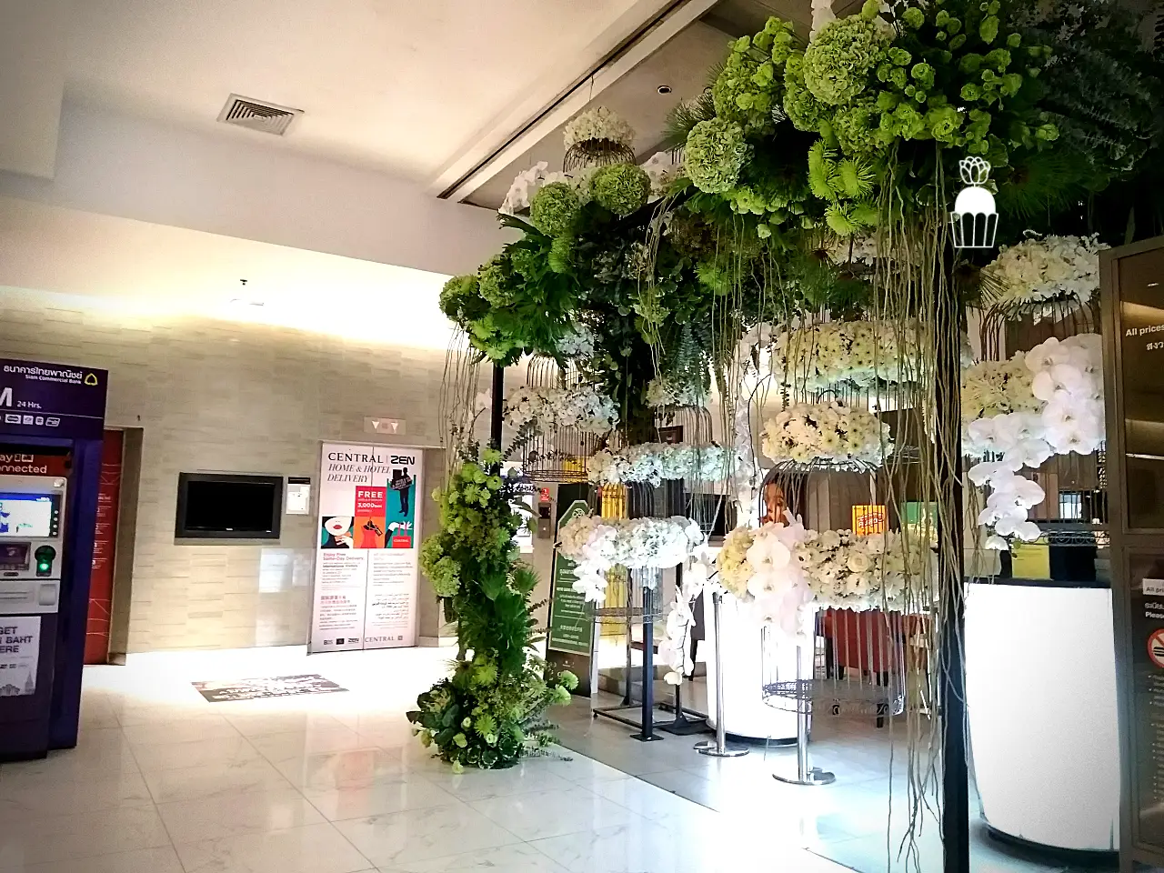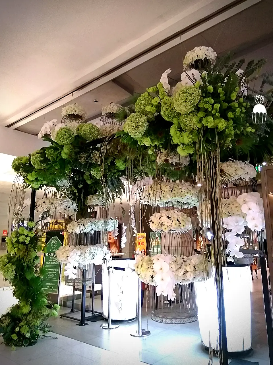 ซุ้มดอกไม้หรูหราด้วยการจัดดอกไม้โทนสีขาวและเขียว