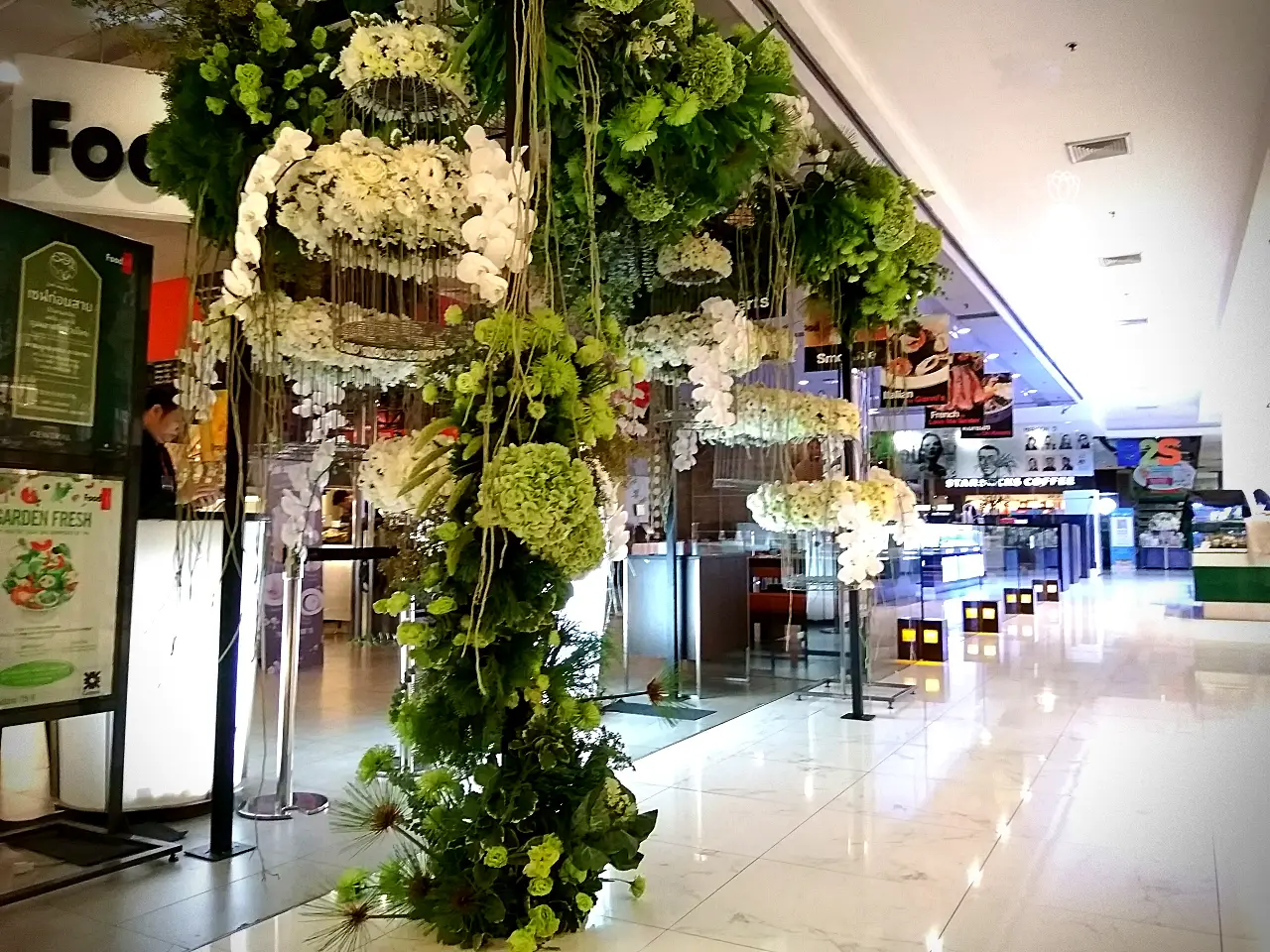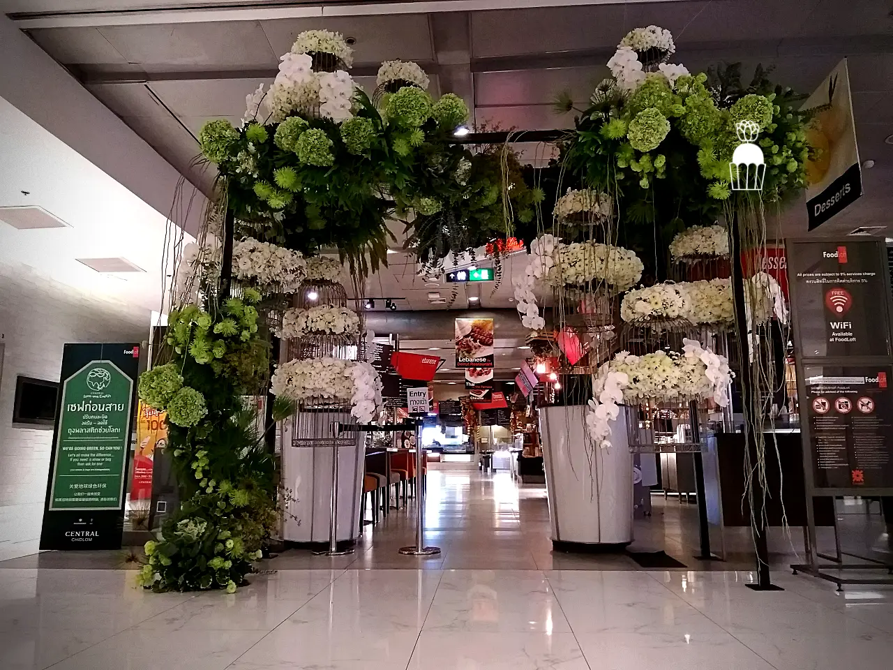 ซุ้มดอกไม้หรูหราด้วยการจัดดอกไม้โทนสีขาวและเขียว