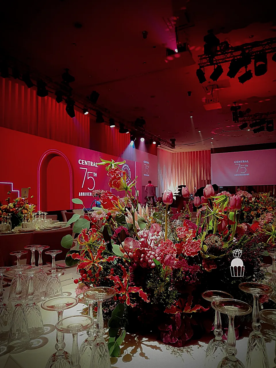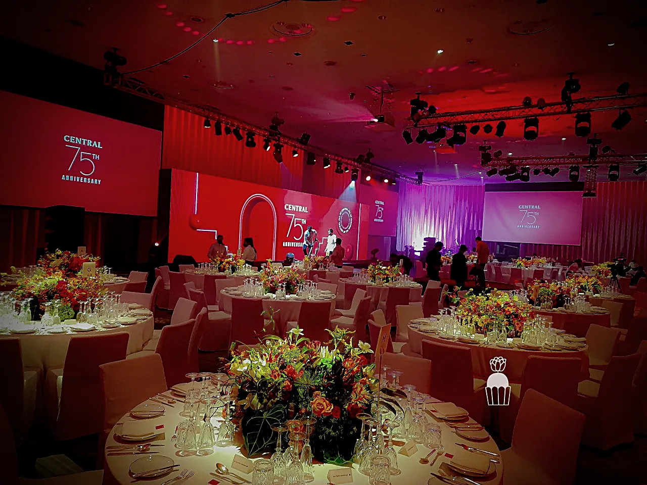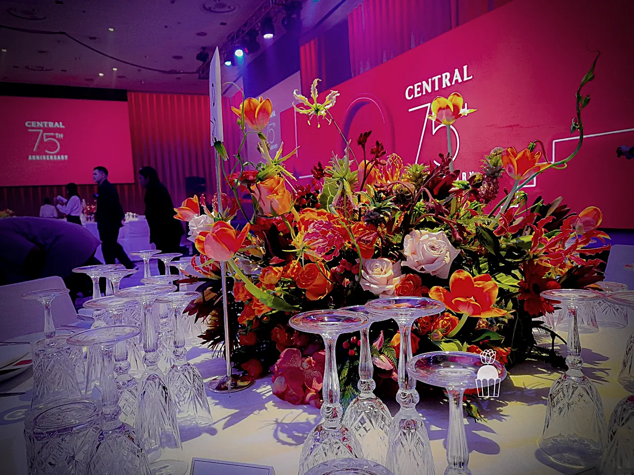 Designing floral arrangements with a mix of multi-colored flowers accented with red tones, reflecting Central’s brand identity and creating a warm, celebratory atmosphere.