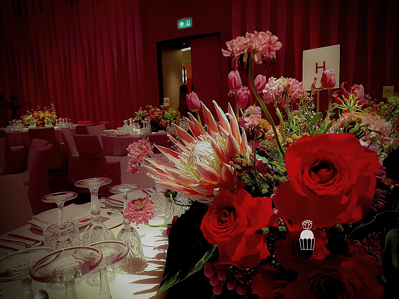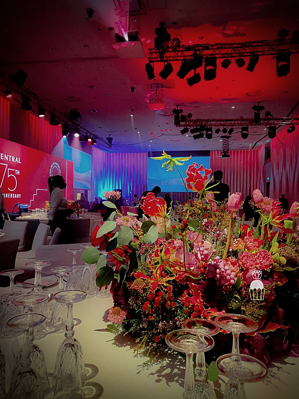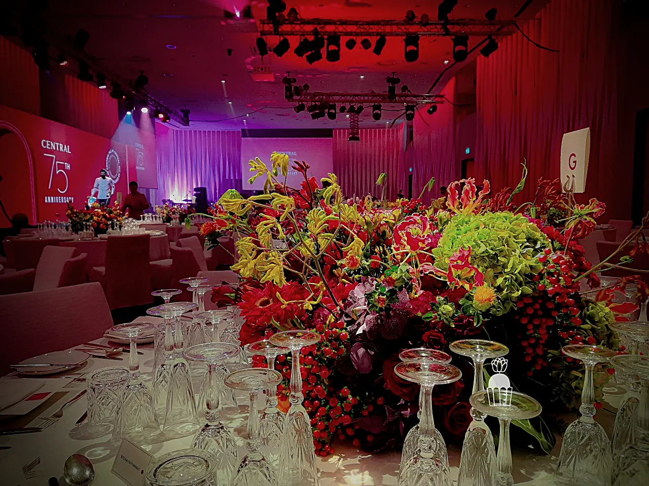 Creating vibrant floral centerpieces placed on dining tables, designed to interact beautifully with the ballroom’s adjustable lighting, allowing the flowers and ambiance to transform as the lighting colors changed.