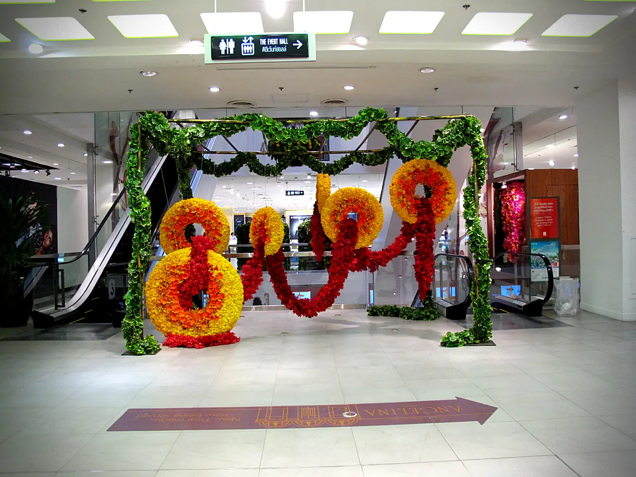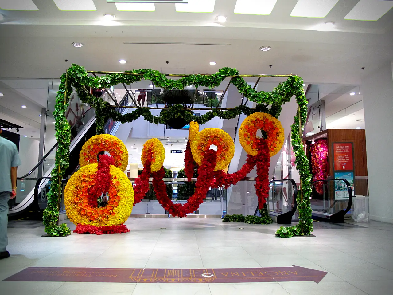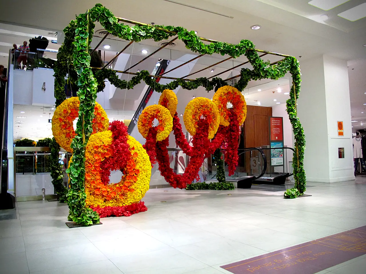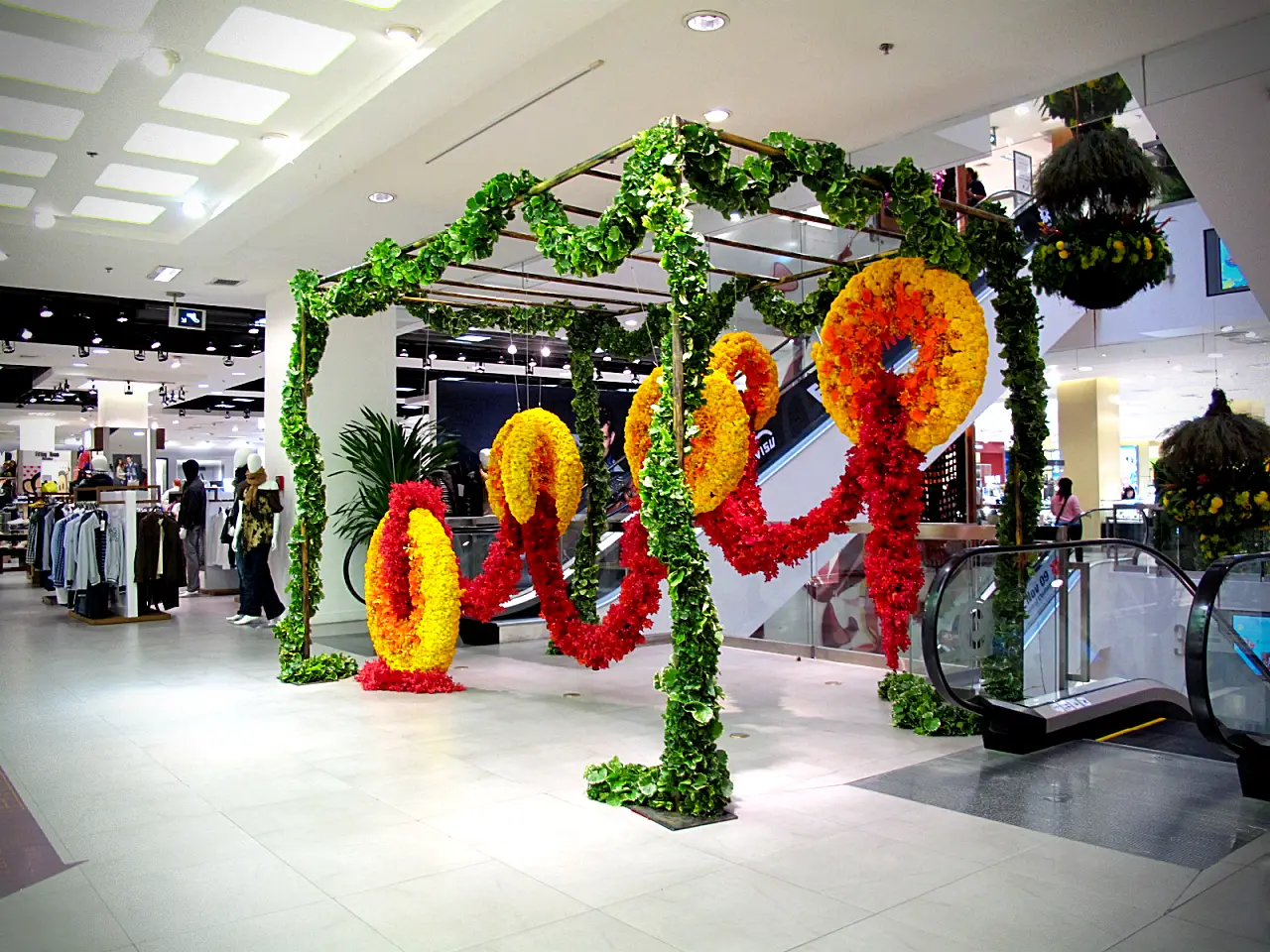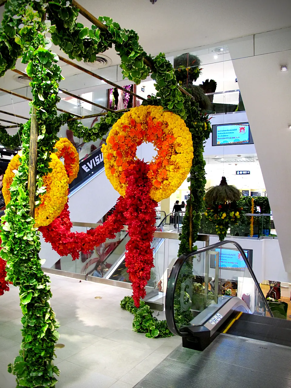 การจัดแสดงดอกไม้ที่โดดเด่น แปลกตา ด้วยดอกไม้ในโทนสีเหลือง ส้ม และแดง จัดเป็นลวดลายวงกลมขนาดใหญ่แขวนจากเถาไม้เลื้อยสีเขียว จัดวางเป็น Layer ให้เป็นมุมมองที่แตกต่างกัน ไม่ว่าจะถ่ายรูปจากมุมไหน เพิ่มพลังและสีสันให้กับสถานที่ โดยมีใบไม้สีเขียวสดช่วยเสริมบรรยากาศความเป็นธรรมชาติ ให้ความรู้สึกทันสมัยและน่าดึงดูด