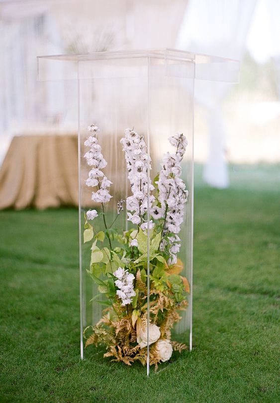 โพเดี่ยม จะใช้โอเอซิส เป็นก้อนห่อพลาสติก มาวางแล้วจัดดอกไม้ ให้เข้ากับโพเดี่ยม