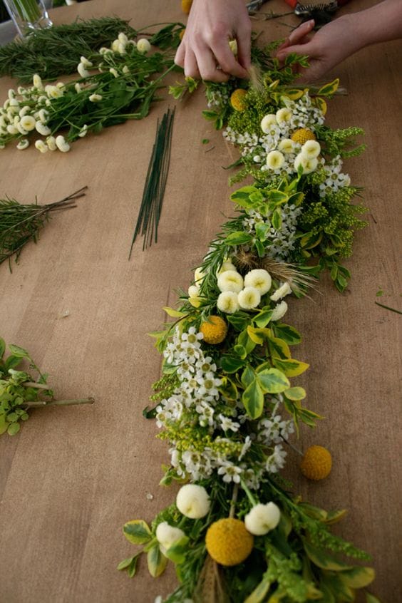 1.ใช้วิธีมัดดอกไม้หรือใบไม้ มารวมกันเป็นเส้น แต่วิธีนี้เหมาะกับใบไม้หรือดอกไม้กึ่งแห้งหรือทำแห้งได้ เพราะจะไม่มีน้ำให้ดอกไม้กินเลย หรือถ้าใช้ของสด ก็จะใช้ในงานได้ในเวลาสั้นๆ 2-3 ชั่วโมง.