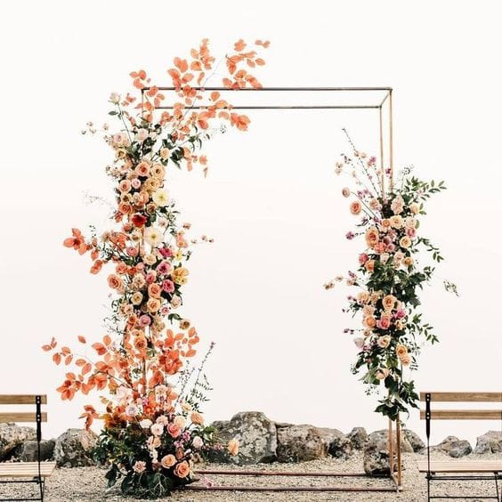 ร้านดอกไม้ หรือช่างดอกไม้ จะเรียกโครงสร้างซุ้มแบบนี้ว่า “ซุ้มเหลี่ยม” ลักษณะเป็นเสา2ข้าง และมีคานพาดด้านบน ความสูงอย่างน้อย 2.20-2.40 เมตร กว้าง 3.6 เมตร เป็นขนาดมาตรฐานที่ใช้จัดดอกไม้และเป็นโครงสร้างสำเร็จรูป ที่แทบทุกร้านดอกไม้จะมีใช้กัน ความแข็งก็จะขึ้นอยู่กับการออกแบบ ถ้าใช้ดอกไม้ในการจัดเยอะ โครงสร้างก็จะแข็งแรงตามไปด้วย.