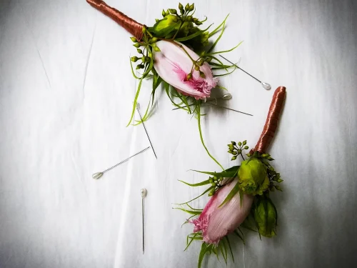 *มีเคล็ดเล็กน้อยสำหรับการติดช่อติดหน้าอก เราจะใช้เข็มหมุด2อัน เกี่ยวเสื้อและให้ปลายเข็มเสียบเข้าไปในก้านดอกค่ะ ช่อดอกไม้ จะไม่แกว่งไป-มาค่ะ*