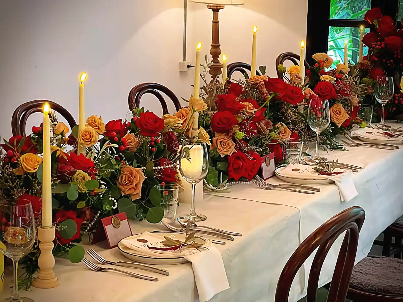 การจัดโต๊ะทานอาหาร เป็นโต๊ะกลม โต๊ะยาว หรือโต๊ะสี่เหลี่ยม นั่งทานกันกันได้ 8-10 ท่านเป็นต้น การจัดโต๊ะนี่ก็เช่นกัน ขึ้นอยู่กับผู้ออกแบบงาน อยากให้งานอยู่ในรูปแบบใด จะวางแจกันดอกไม้ตรงกลางโต๊ะ จะจัดเป็นทรงพุ่มเตี้ย ทรงสูง หรือจะใช้ขวดแช่ดอกไม้1ก้าน แล้ววางเป็นกลุ่มก็ได้ ไม่มีผิดถูกแต่อย่างใด ตามสบายเลยค่ะ บางงานอาจมี ของตกแต่งอื่นมาวางด้วย เช่น เทียนหอม ตะเกียง เชิงเทียน หรือกรณีเป็นแบรนด์สินค้า อาจนำสินค้าตัวอย่างมาวางประกอบด้วย ก็ได้ค่ะ