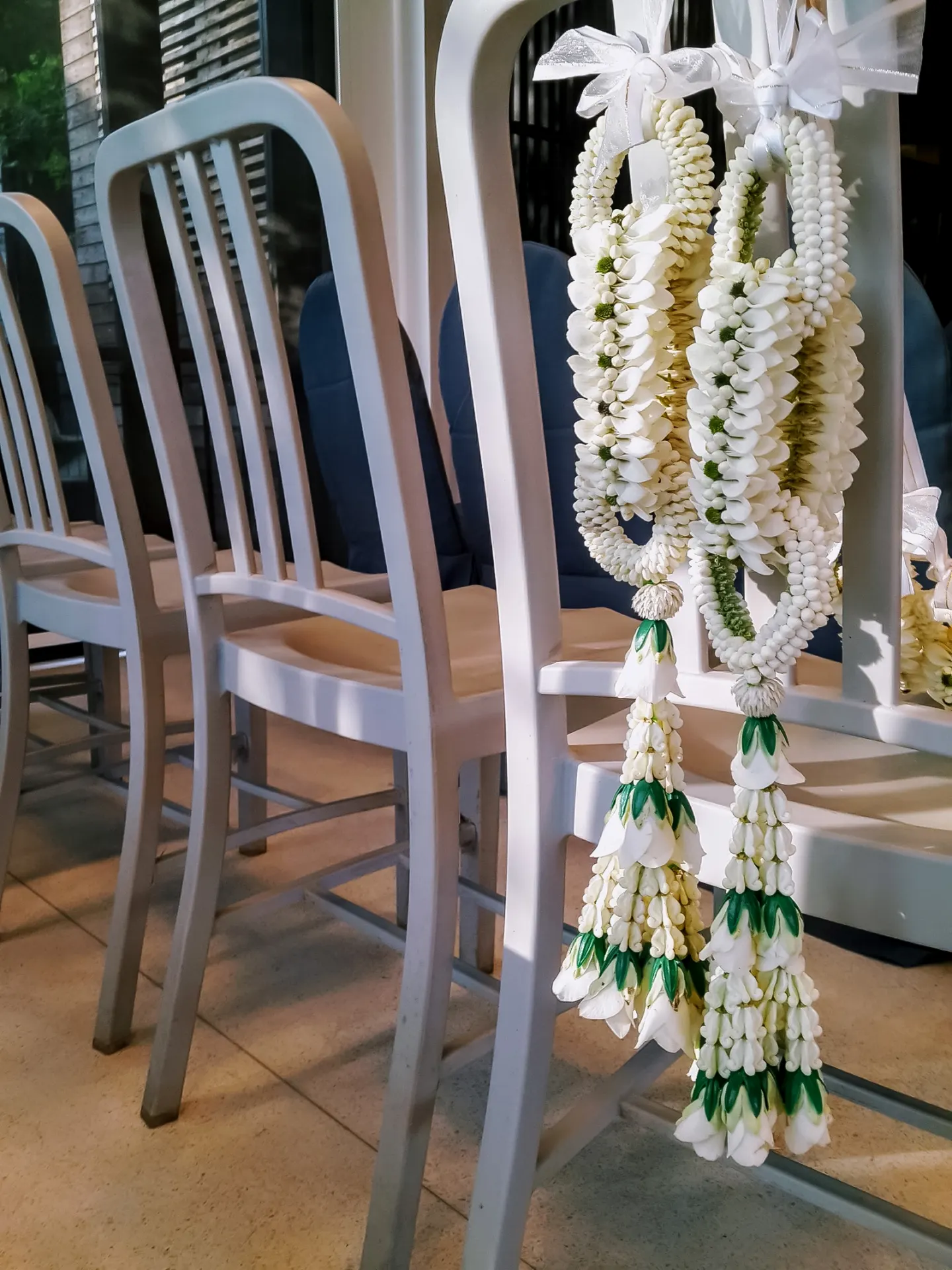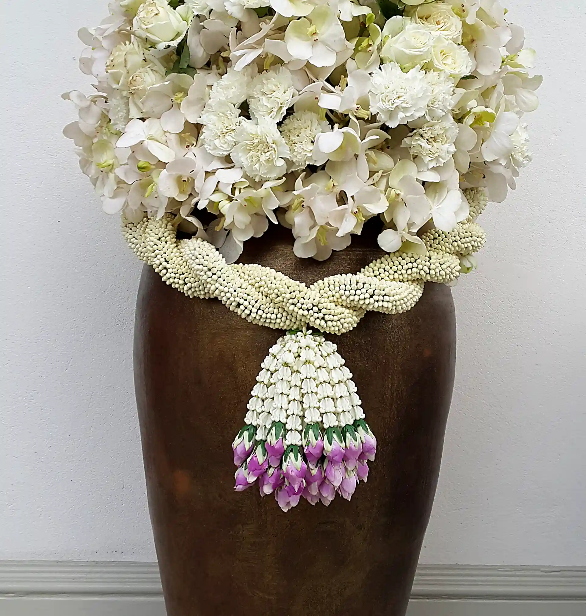 พวงมาลัย ดอกไม้ภูมิปัญญาของคนไทยแท้แต่โบราณ ในงานแต่งงานจะใช้พวงมาลัยอยู่มาก เช่น ใช้คล้องคอบ่าวสาว ,ไหว้ผู้ใหญ่ หรือถวายพระ แต่พวงมาลัยสามารถนำมาประยุกต์ใช้ ตกแต่งสถานที่ได้ เช่นประดับในแจกัน ในภาพตัวอย่าง ใช้ประดับปากกระถางปูน ทำเป็นเครื่องแขวน วางตามจุดต่างภายในห้องก็ได้ค่ะ