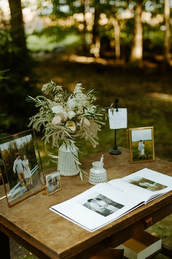เป็นโต๊ะที่ให้แขกเซ็นชื่อก่อนเข้างาน วางไว้มุมใดมุมหนึ่งหรือวางตรงกลาง อาจจะจัดดอกไม้เป็นทรงเตี้ยๆหน่อย ไม่สูงมากเพราะต้องมีผู้คนทำกิจกรรมตรงนี้เยอะมาก ถ้าจัดดอกไม้สูงไป และอาจเผลอมือปัดไปโดน แจกันอาจจะล้มได้ค่ะ