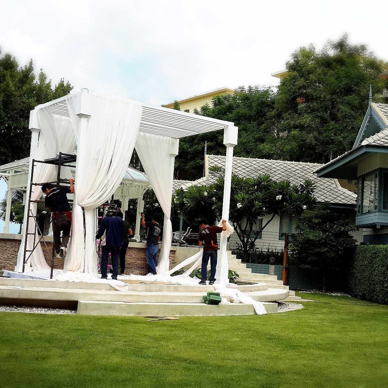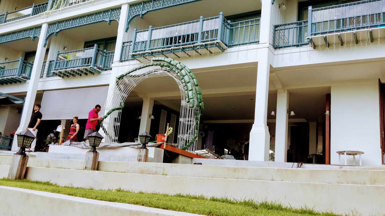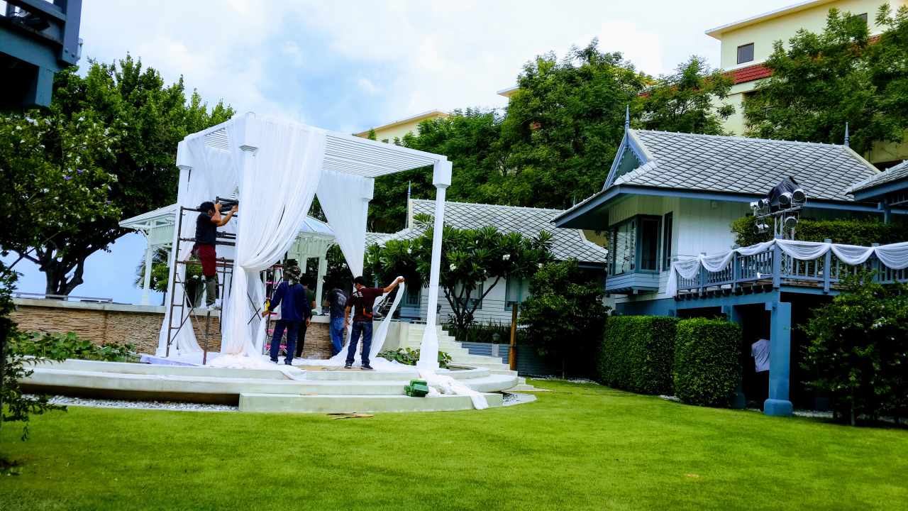 การจัดดอกไม้เน้นบริเวณ ศาลา (Gazebo) เป็นจุดศูนย์กลางของพิธี พร้อมซุ้มโค้งดอกไม้ เป็นจุดทางเดินเข้างาน ที่ช่วยขับบรรยากาศให้ดูอ่อนโยนและโรแมนติก