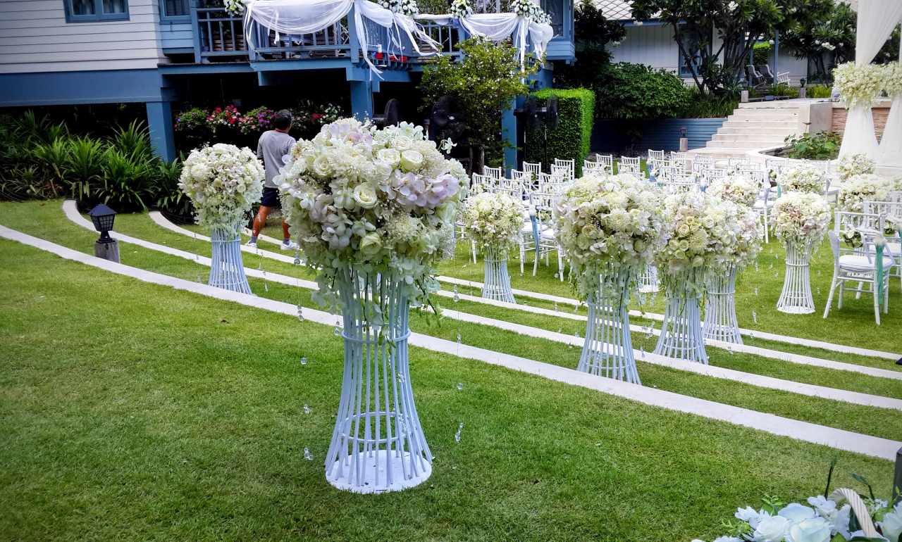 ทางเดินเข้าสู่พิธีตกแต่งด้วย flower stand สองข้างทาง จัดวางอย่างโปร่งสบาย รับแสงธรรมชาติและวิวทะเล