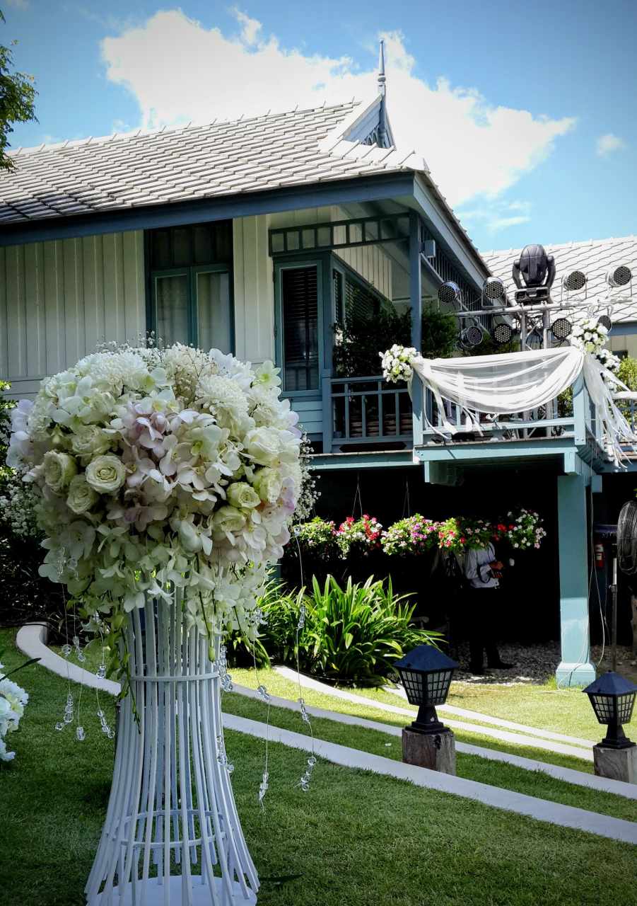การจัดดอกไม้เน้นบริเวณ ศาลา (Gazebo) เป็นจุดศูนย์กลางของพิธี พร้อมซุ้มโค้งดอกไม้ เป็นจุดทางเดินเข้างาน ที่ช่วยขับบรรยากาศให้ดูอ่อนโยนและโรแมนติก