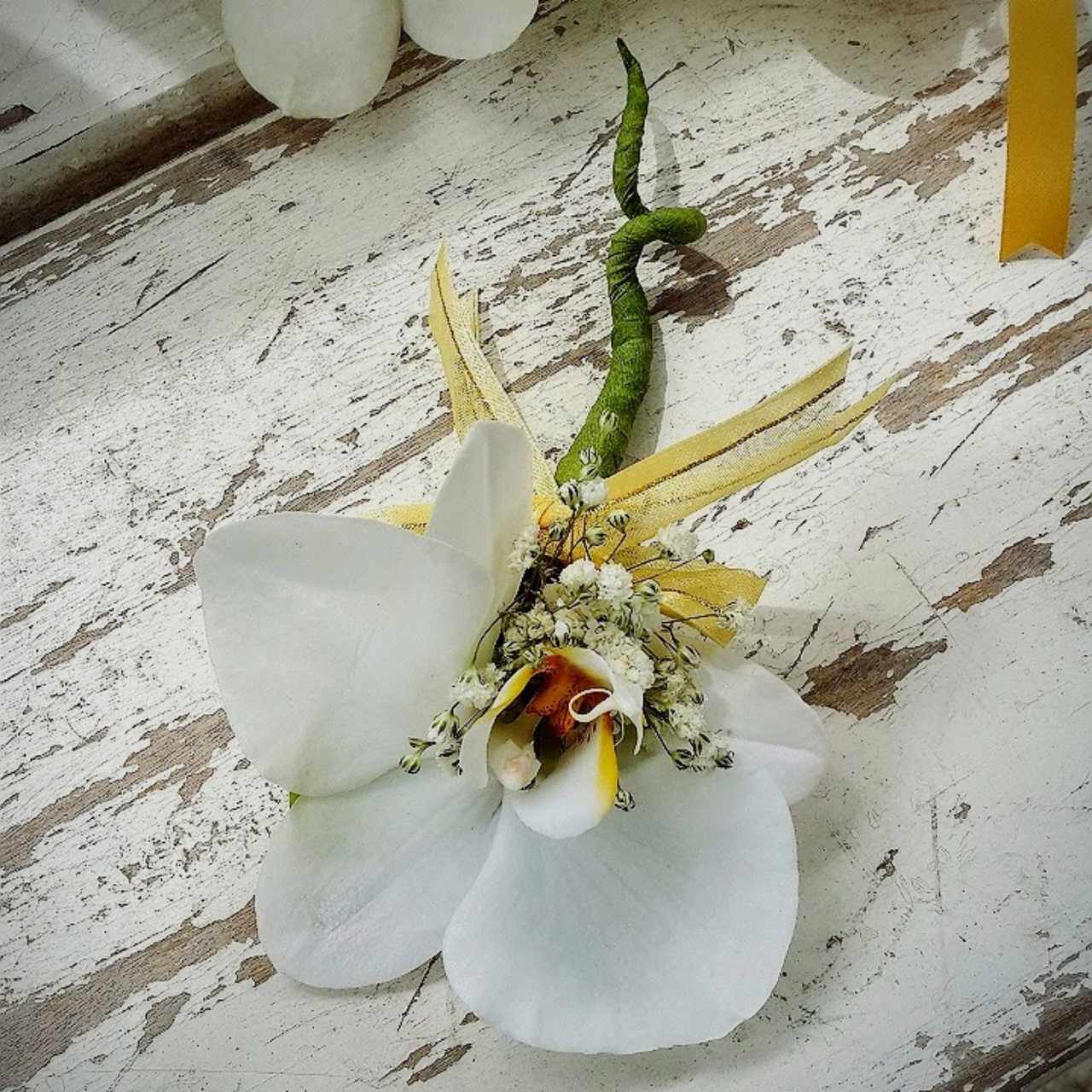 ตกแต่งด้วยดอกไม้โทนขาวและเขียว ให้ความรู้สึกเรียบ หวาน และอบอุ่น