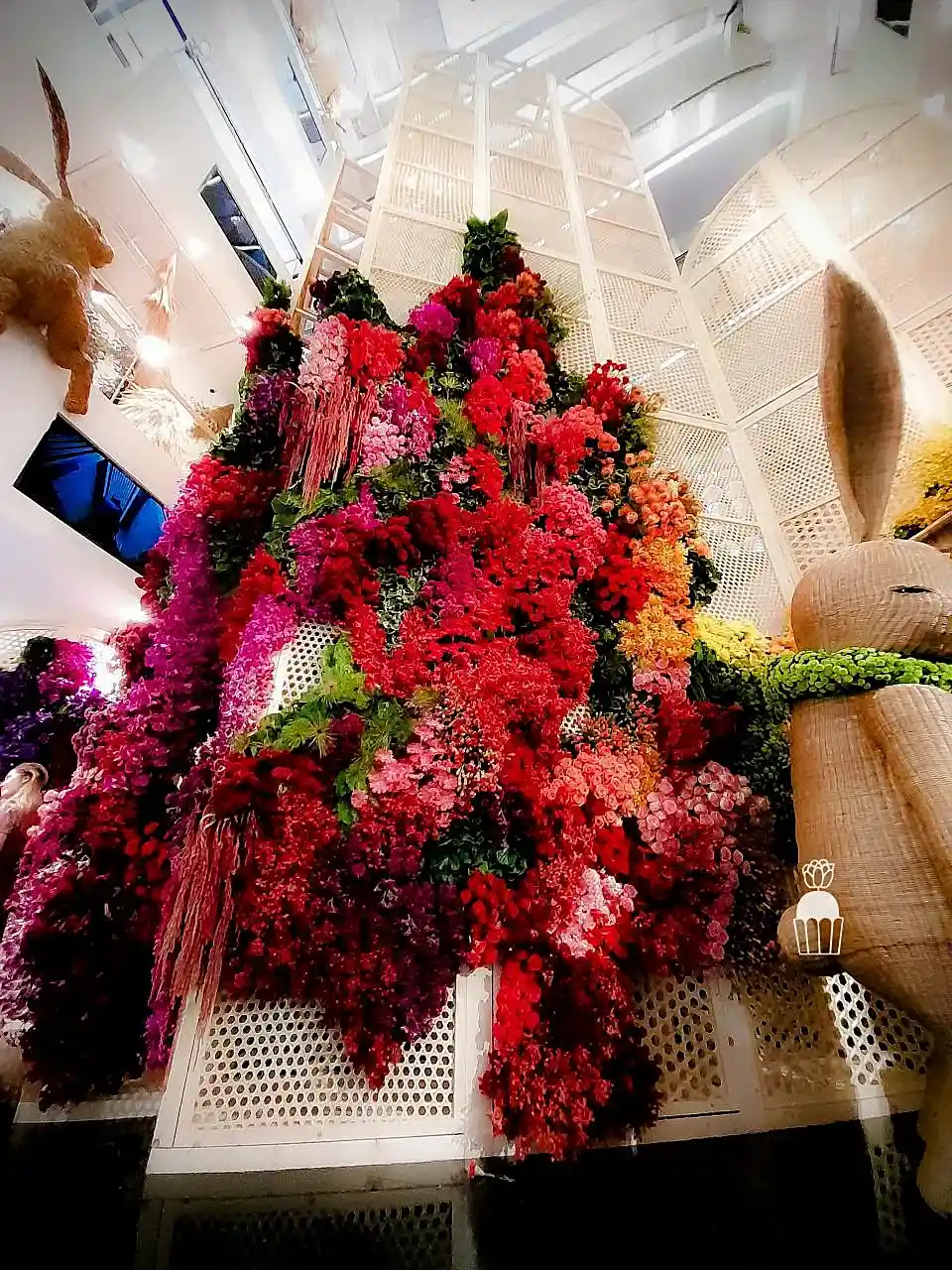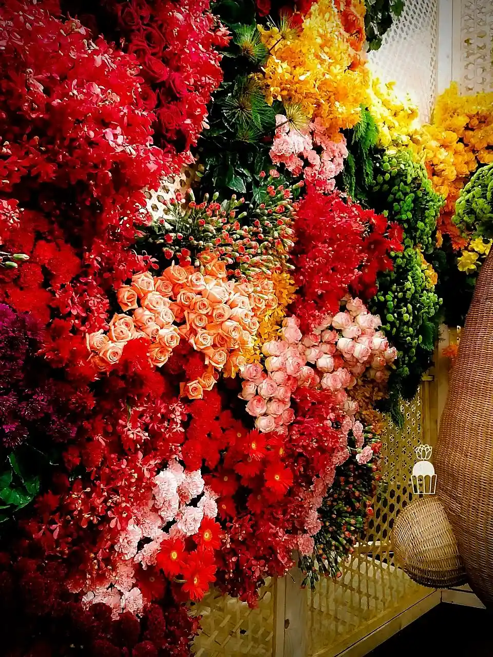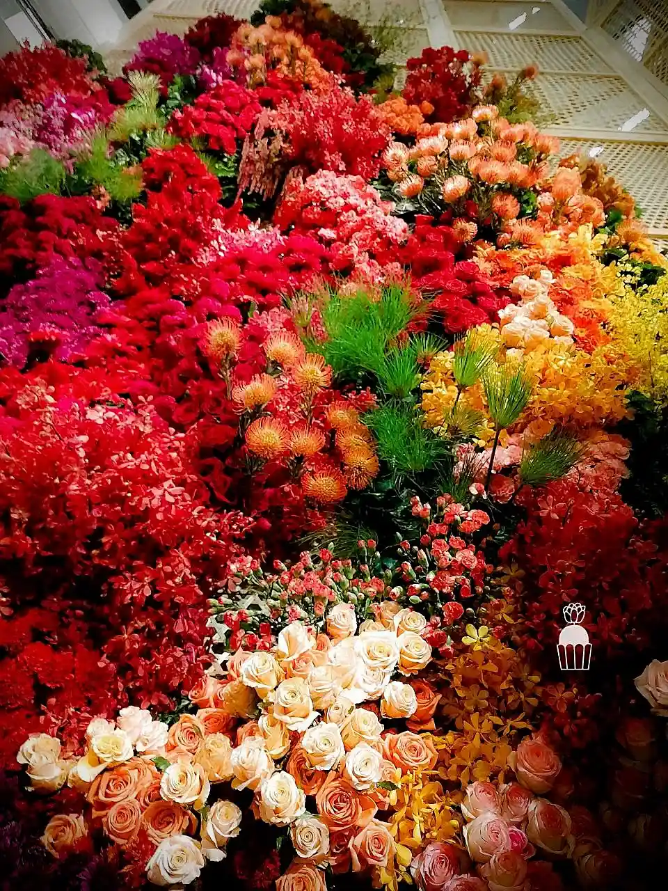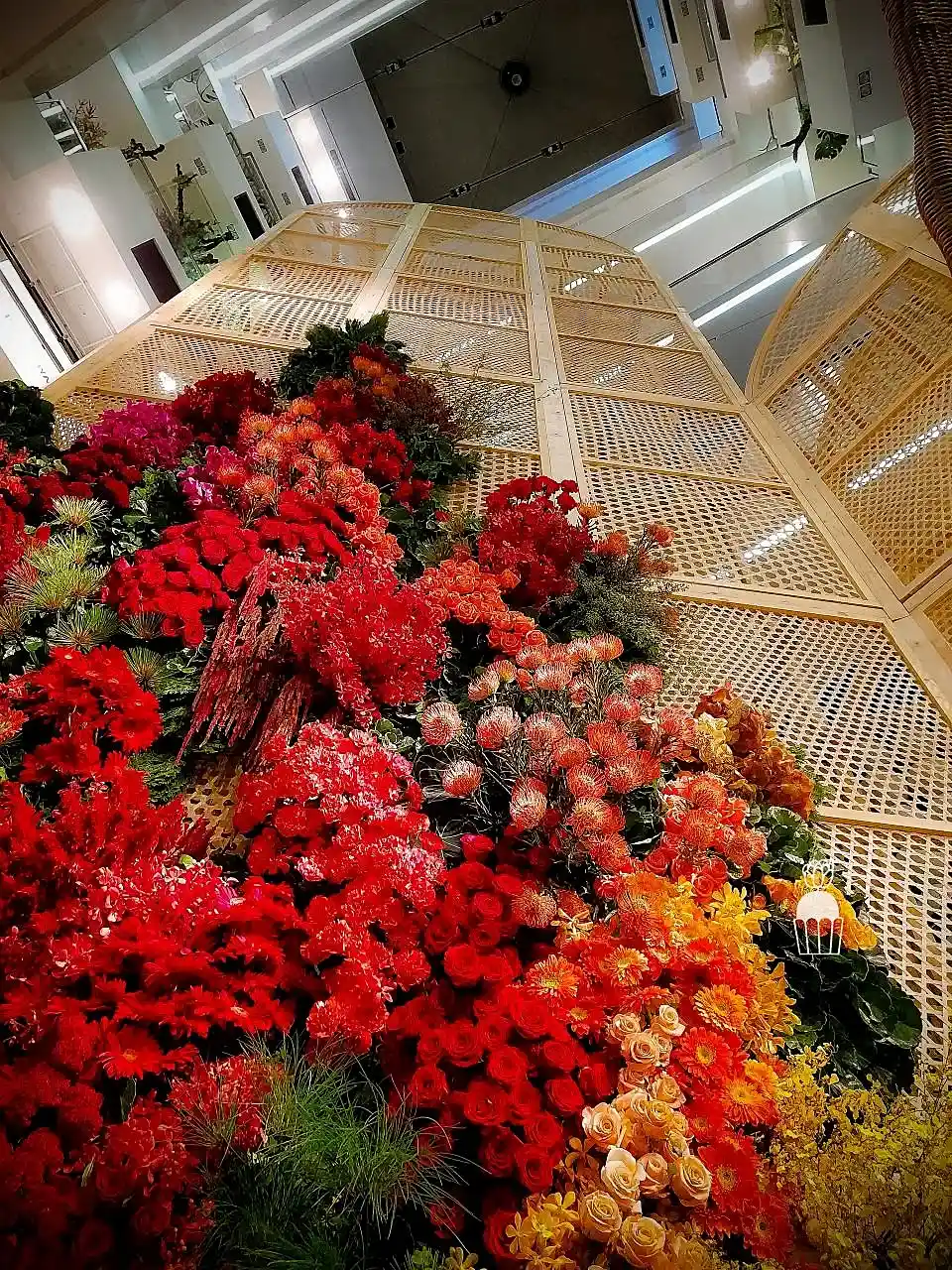 This floral arrangement showcases elegance and sophistication, featuring a variety of colorful flowers meticulously arranged to create a striking visual within a shopping mall. Using red, pink, orange, and green tones, the display evokes a sense of warmth and freshness. The flowers used include roses, carnations,orchid and pincushion, enhancing the atmosphere with vibrancy and charm.