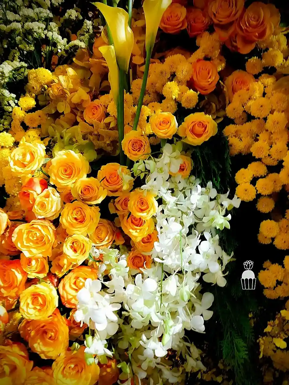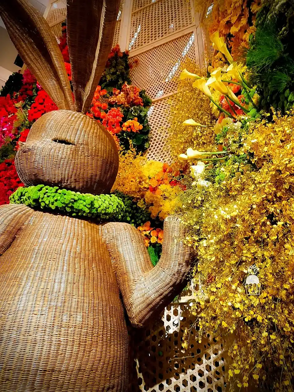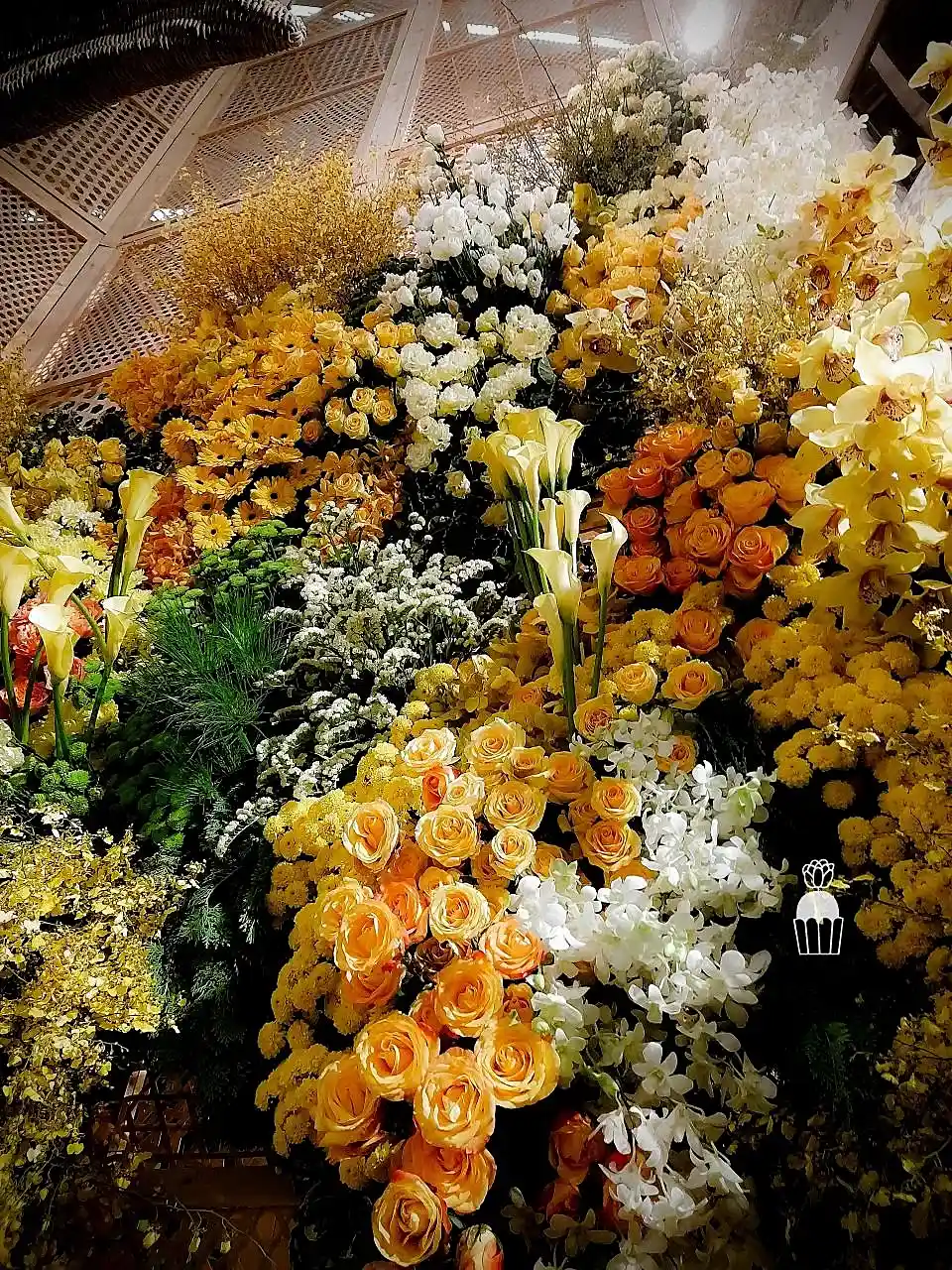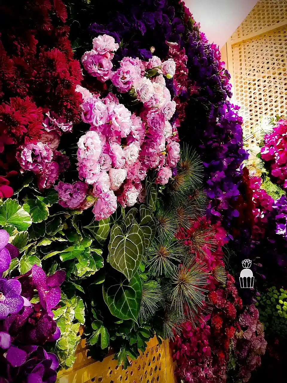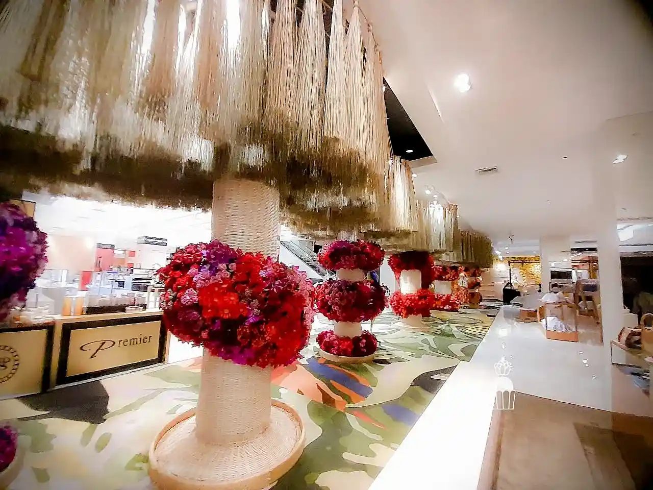 This floral arrangement showcases elegance and sophistication, featuring a variety of colorful flowers meticulously arranged to create a striking visual within a shopping mall. Using red, pink, orange, and green tones, the display evokes a sense of warmth and freshness. The flowers used include roses, carnations,orchid and pincushion, enhancing the atmosphere with vibrancy and charm.
