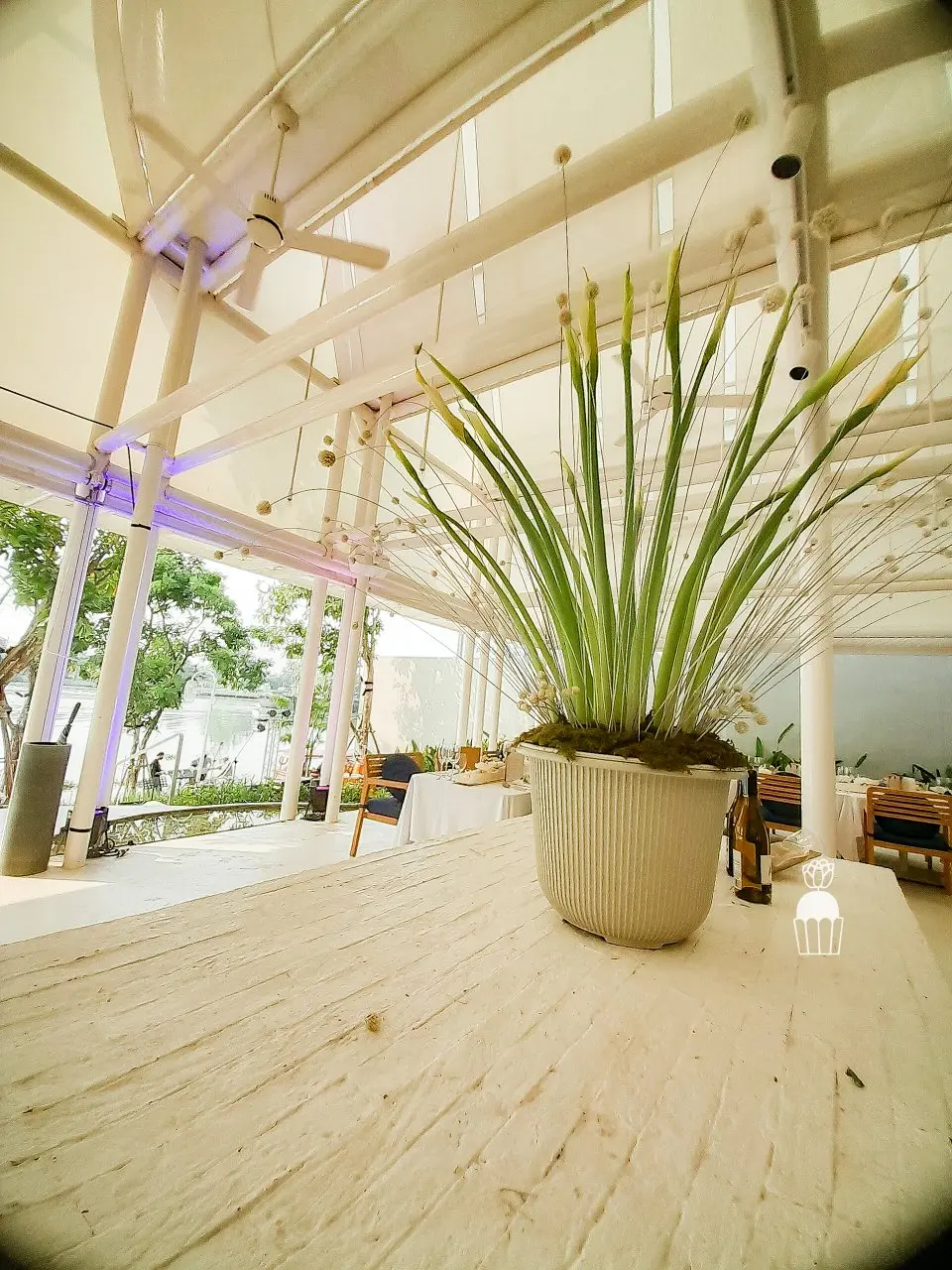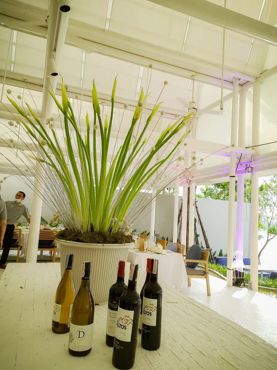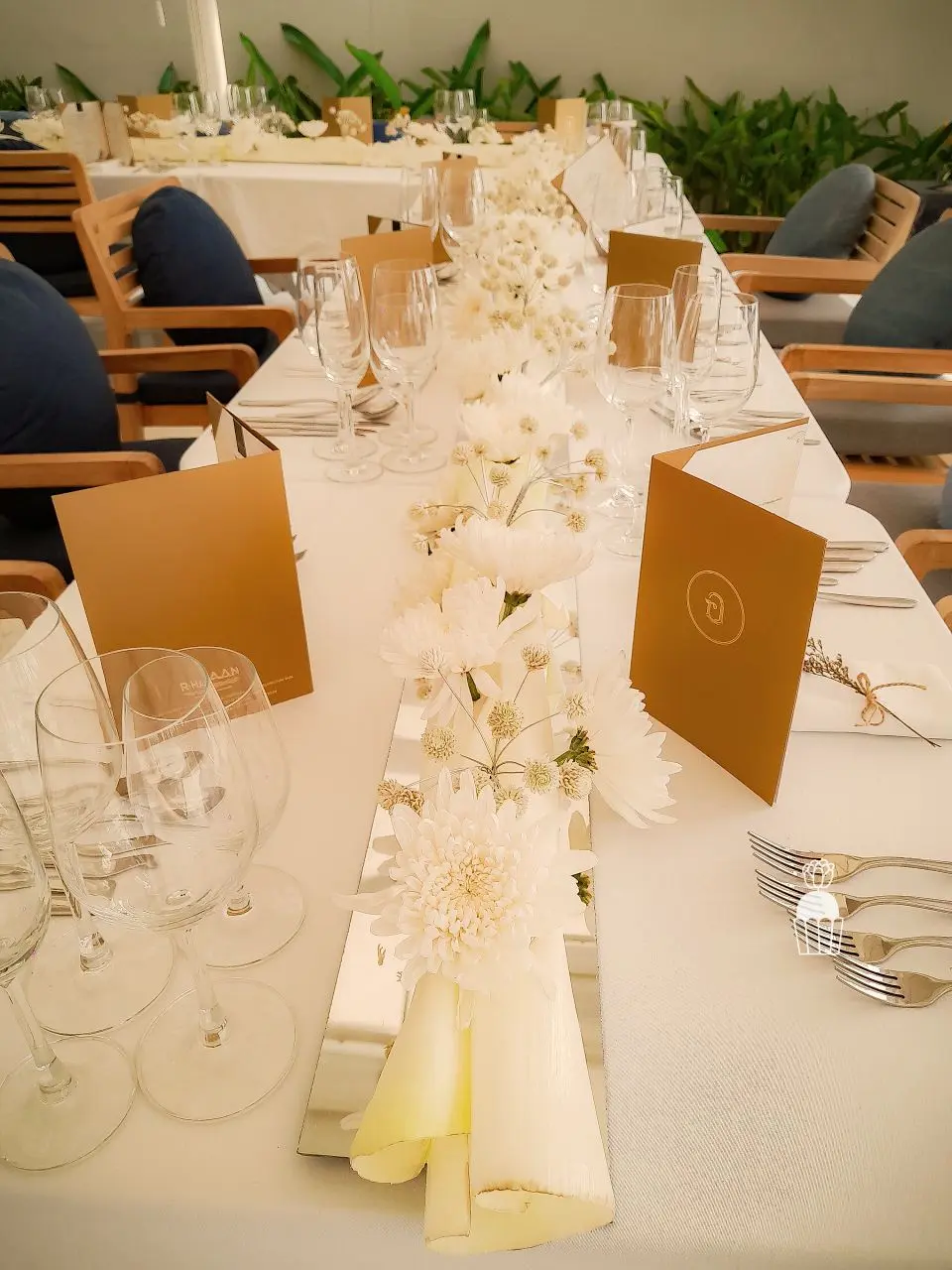 การจัดดอกไม้บนโต๊ะกินอาหารซึ่งเป็นโต๊ะทรงยาวและแคบ (long table) ถูกออกแบบให้มี centerpieces ขนาดใหญ่ นอกจากนี้ยังเพิ่มความพิเศษด้วยงาน DIY โดยการใช้ กาบดอกพลับพลึงม้วนเป็นฐาน สำหรับการจัดดอกไม้ ทำให้ได้การตกแต่งที่มีความสร้างสรรค์และไม่ซ้ำใคร ตกแต่งด้วยดอกคริสแซนติมัมสีขาวเสริมรายละเอียดให้กับการจัดวางดอกไม้บนโต๊ะ ช่วยเพิ่มความหวานและความสง่างามให้กับบรรยากาศโดยรวม