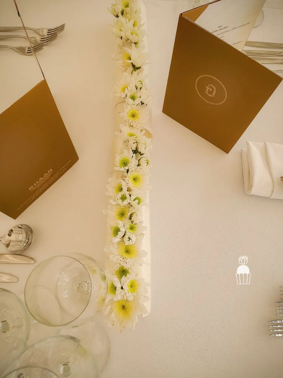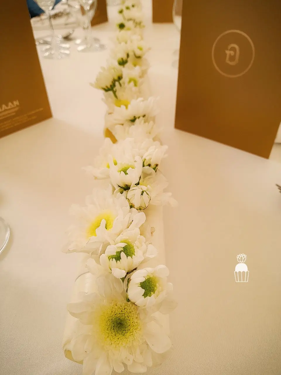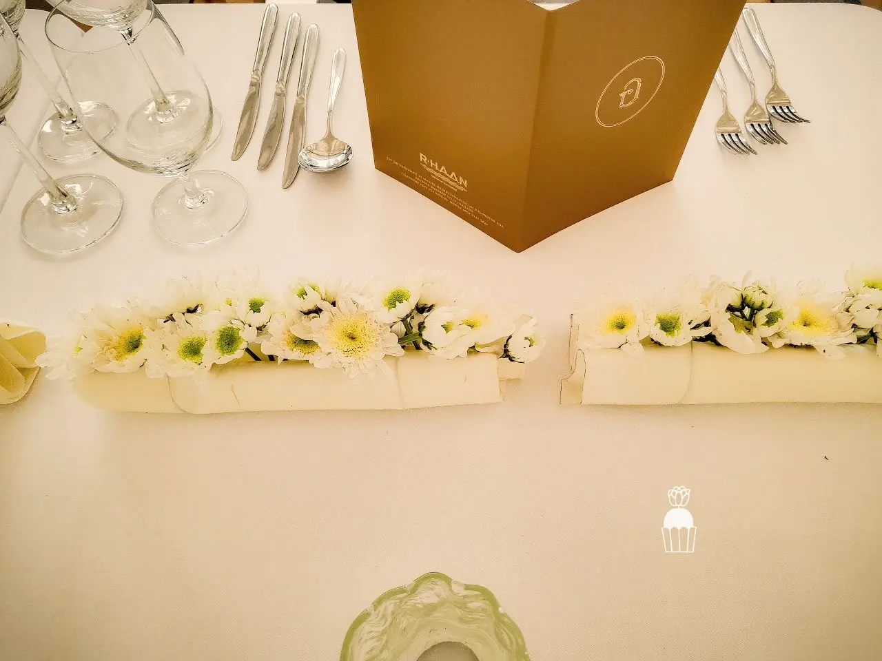 การจัดดอกไม้บนโต๊ะกินอาหารซึ่งเป็นโต๊ะทรงยาวและแคบ (long table) ถูกออกแบบให้มี centerpieces ขนาดใหญ่  นอกจากนี้ยังเพิ่มความพิเศษด้วยงาน DIY โดยการใช้ กาบดอกพลับพลึงม้วนเป็นฐาน สำหรับการจัดดอกไม้ ทำให้ได้การตกแต่งที่มีความสร้างสรรค์และไม่ซ้ำใคร ตกแต่งด้วยดอกคริสแซนติมัมสีขาวเสริมรายละเอียดให้กับการจัดวางดอกไม้บนโต๊ะ ช่วยเพิ่มความหวานและความสง่างามให้กับบรรยากาศโดยรวม