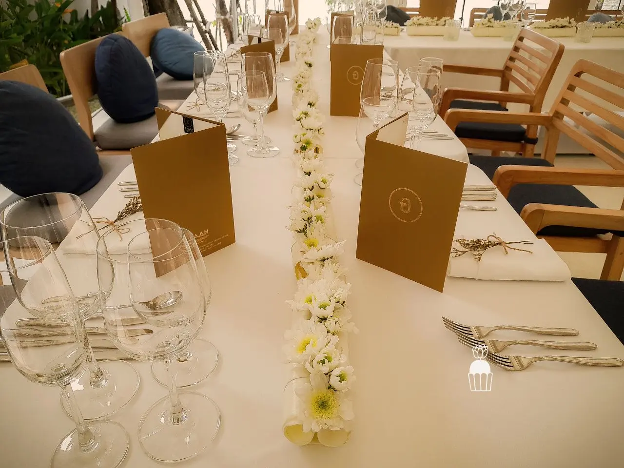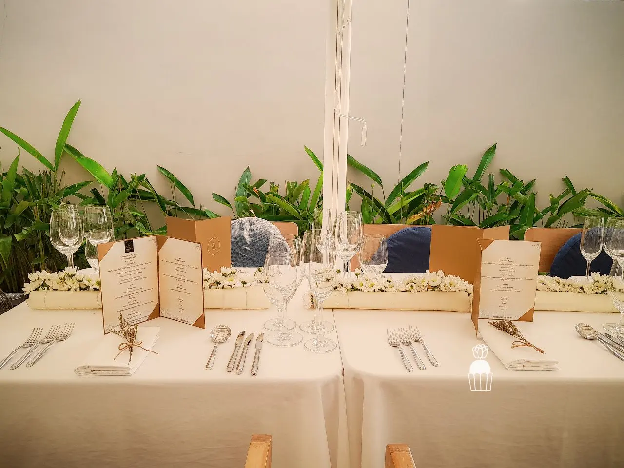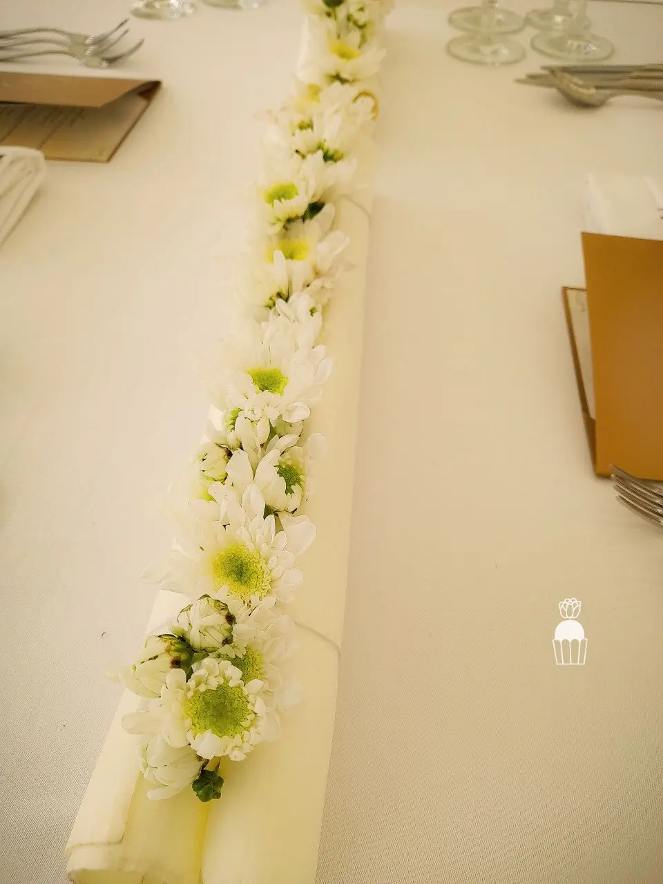 การจัดดอกไม้บนโต๊ะกินอาหารซึ่งเป็นโต๊ะทรงยาวและแคบ (long table) ถูกออกแบบให้มี centerpieces ขนาดใหญ่  นอกจากนี้ยังเพิ่มความพิเศษด้วยงาน DIY โดยการใช้ กาบดอกพลับพลึงม้วนเป็นฐาน สำหรับการจัดดอกไม้ ทำให้ได้การตกแต่งที่มีความสร้างสรรค์และไม่ซ้ำใคร ตกแต่งด้วยดอกคริสแซนติมัมสีขาวเสริมรายละเอียดให้กับการจัดวางดอกไม้บนโต๊ะ ช่วยเพิ่มความหวานและความสง่างามให้กับบรรยากาศโดยรวม