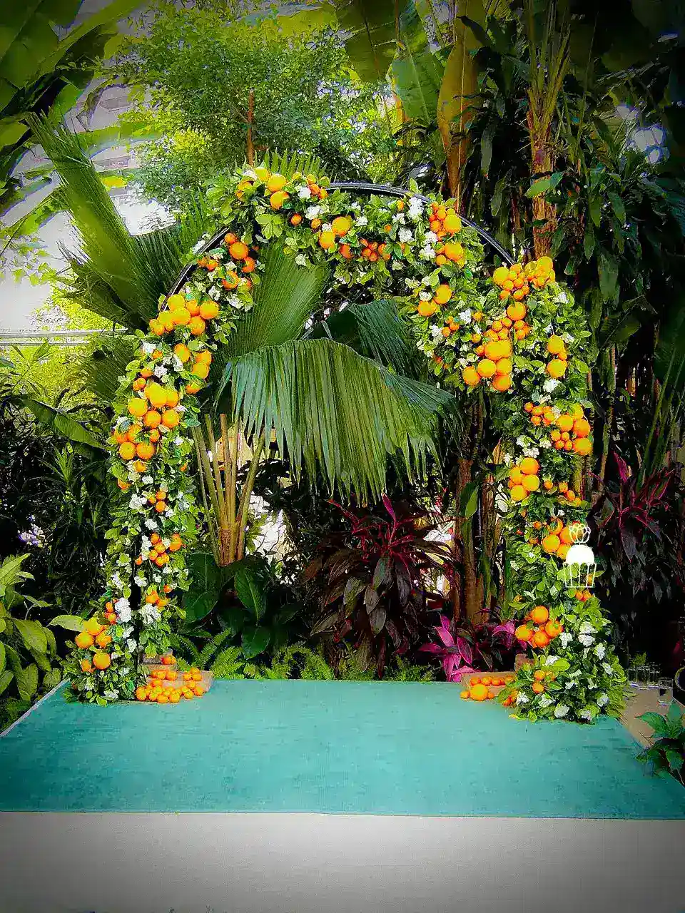Fragrant gardenias and lush greenery were paired with sun-kissed oranges to add a fresh and distinctive touch. Yellow and white flowers such as white roses, lisianthus, and golden blooms were delicately arranged throughout the church and garden areas.