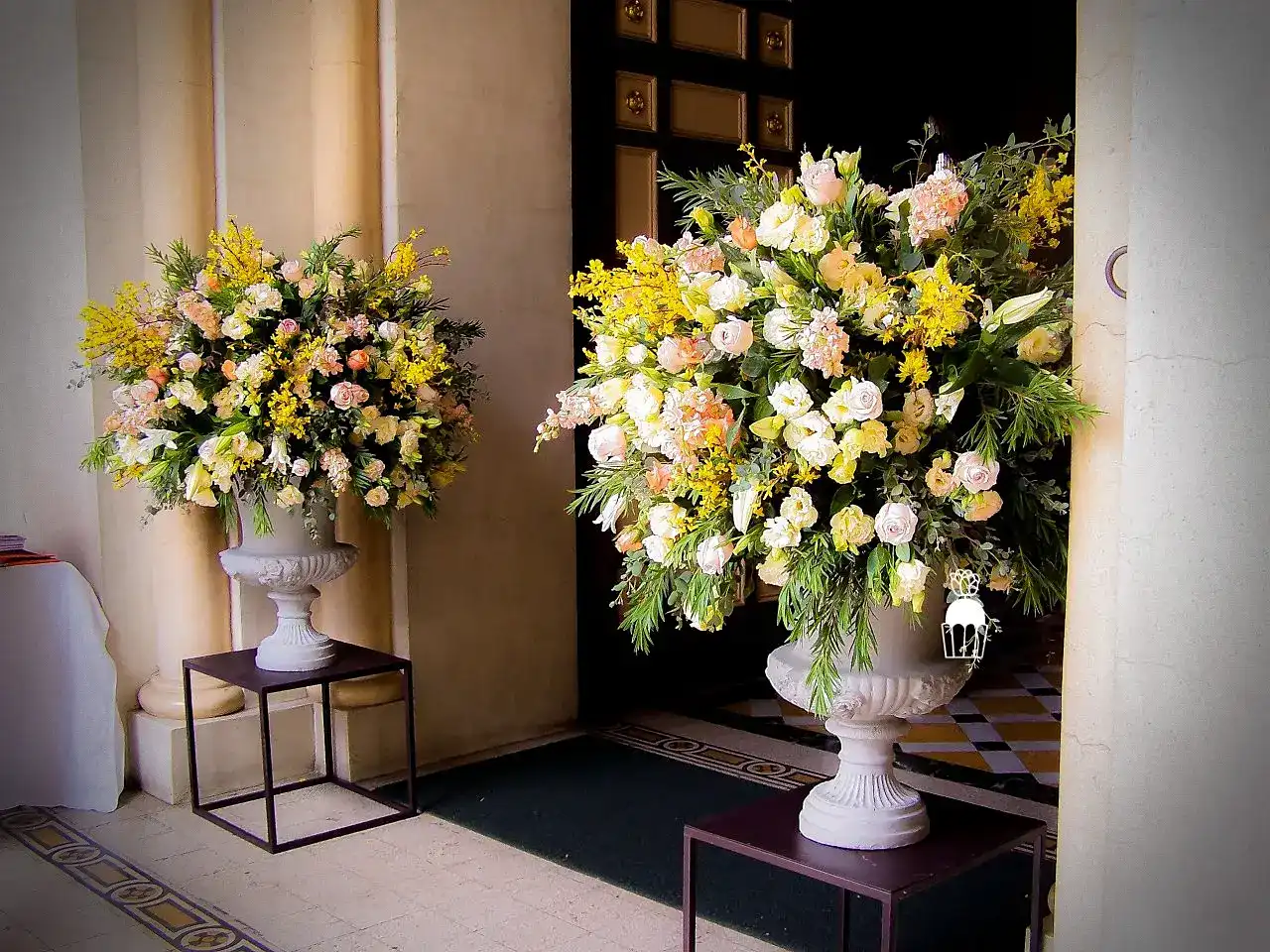 งานแต่งงานในบรรยากาศแสนโรแมนติก ณ โบสถ์อัสสัมชัญ และ สวนหน้าท่าเรือโอเรียนเต็ล กรุงเทพ เป็นสถานที่ในฝันของคู่รักหลายคู่ การจัดดอกไม้จึงออกแบบให้สอดคล้องกับสถานที่ โดยเน้นโทนสีเหลืองและขาว สื่อถึงความสง่างามและความบริสุทธิ์