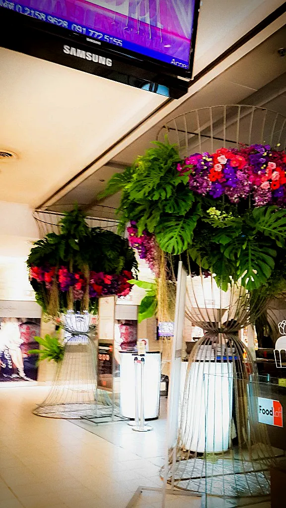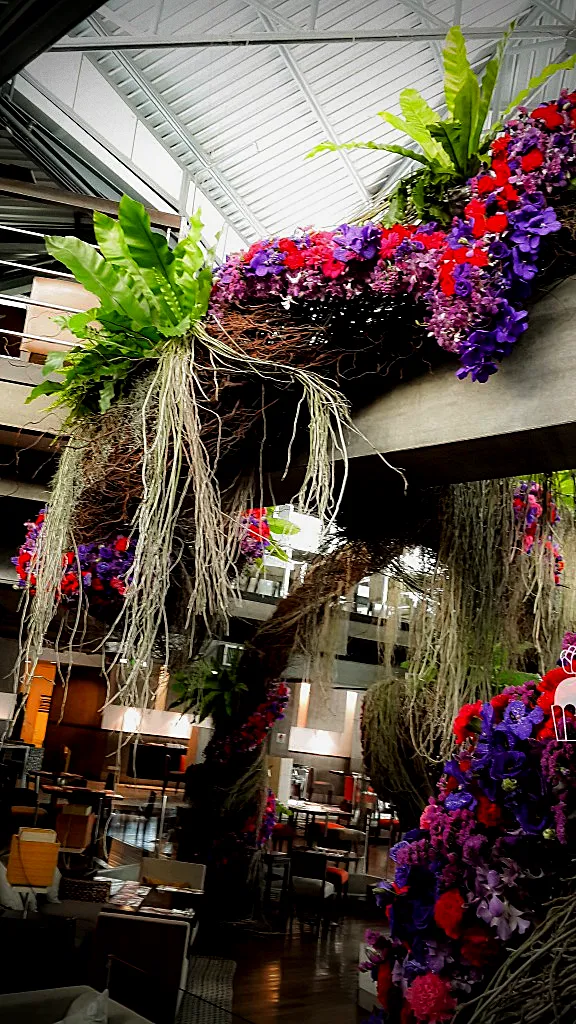 The lush green hanging plants and bright red flowers create a lively and refreshing atmosphere, ideal for inspiring interior design , gardening , or event decoration ideas. Perfect for those looking to enhance indoor spaces with nature’s beauty.