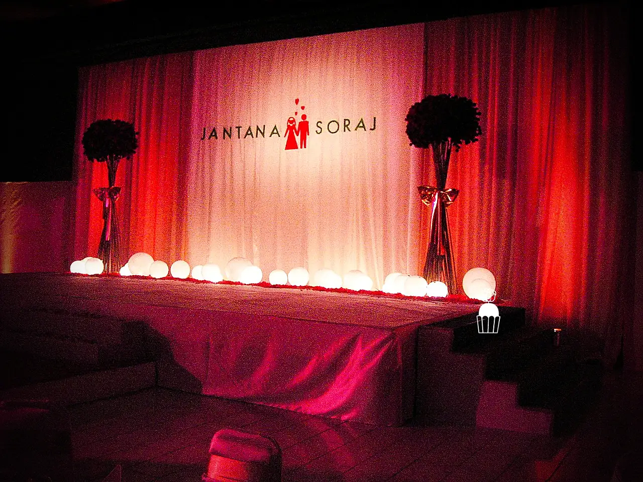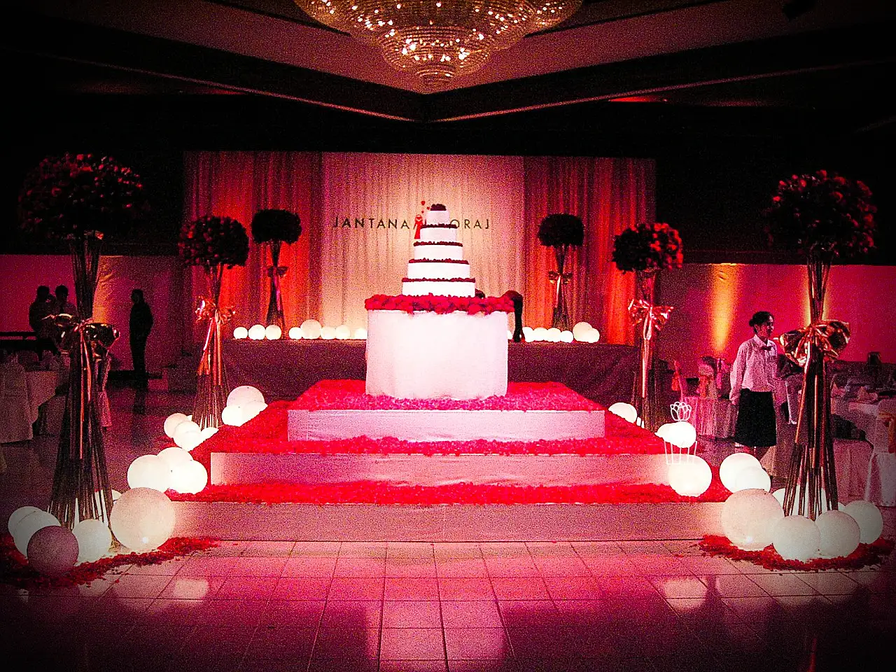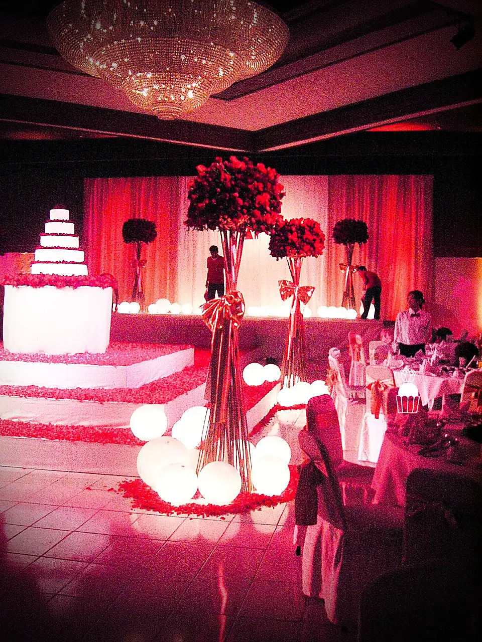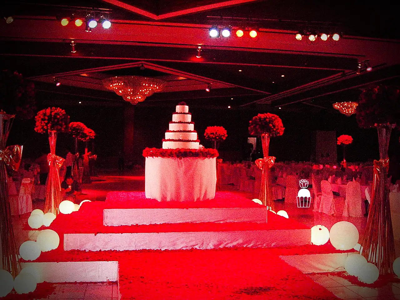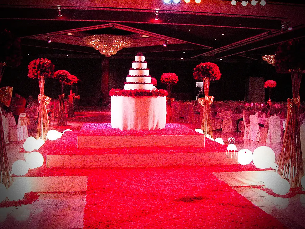 A wedding fully styled with red roses, enhanced by red lighting to create a bold, romantic, and memorable atmosphere.