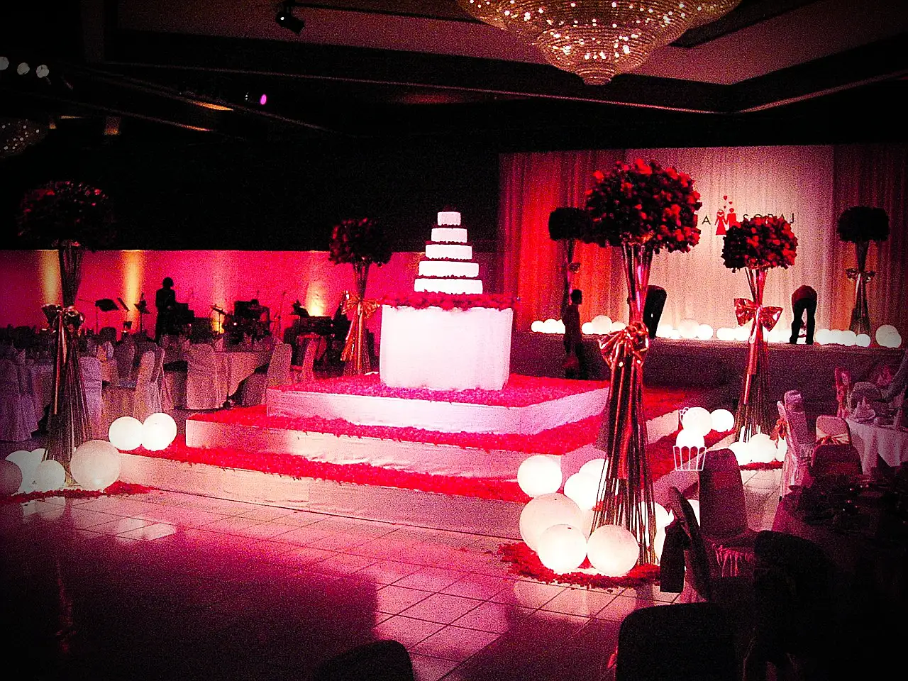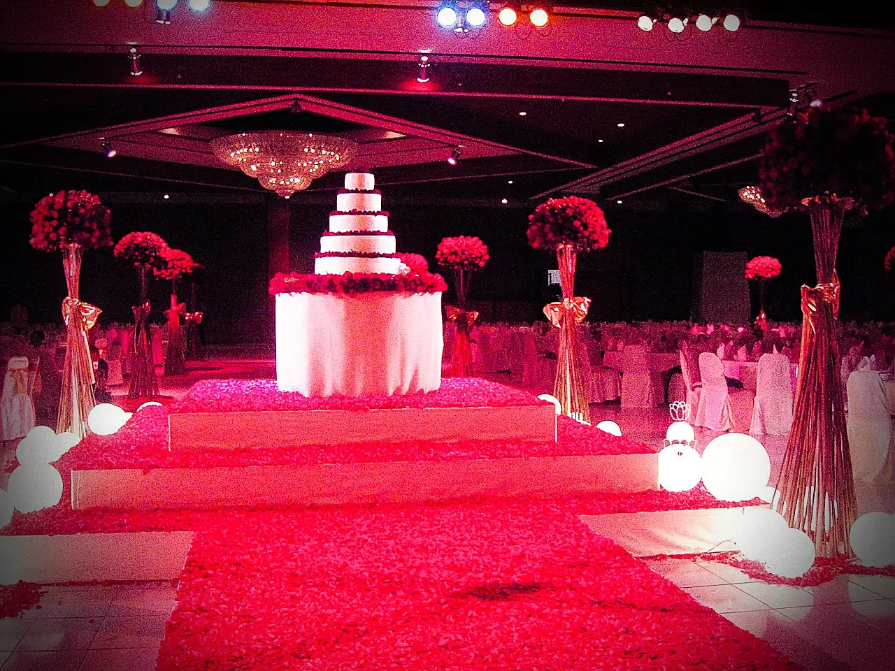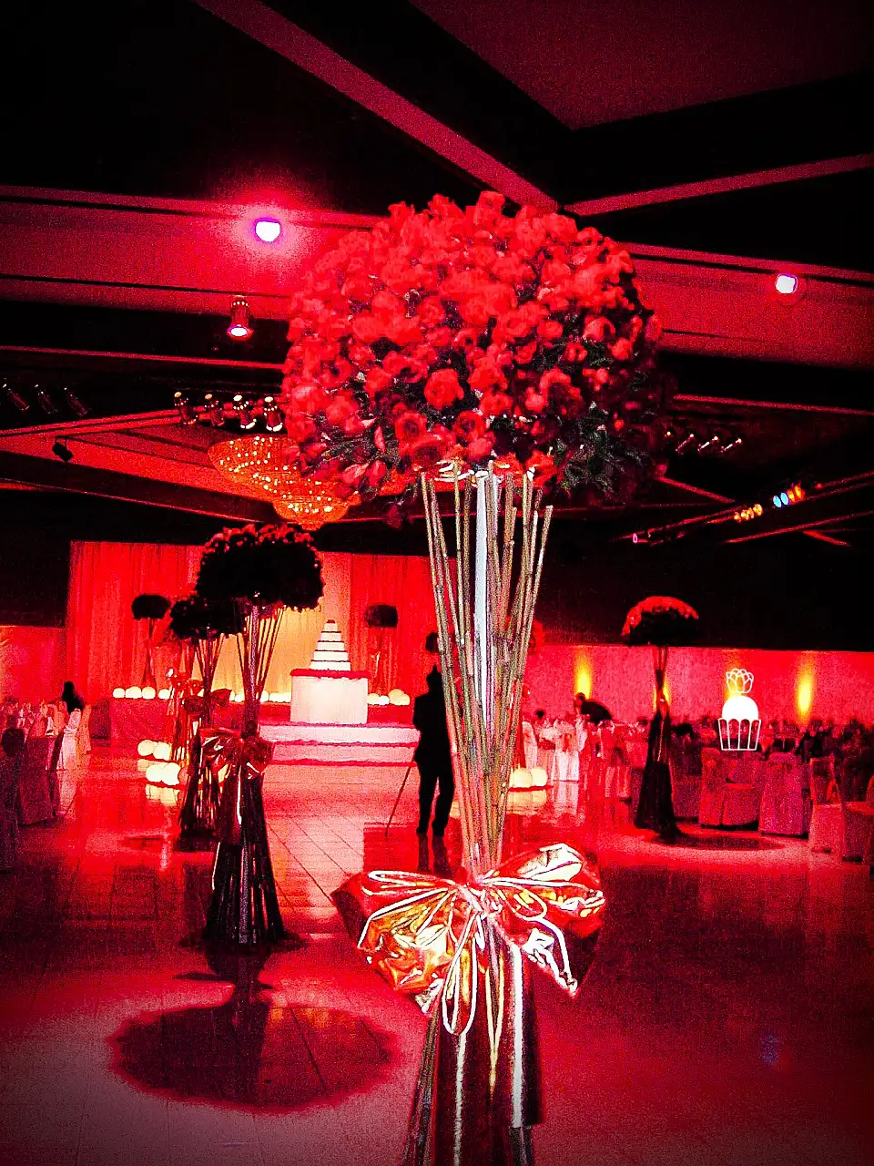A wedding fully styled with red roses, enhanced by red lighting to create a bold, romantic, and memorable atmosphere.