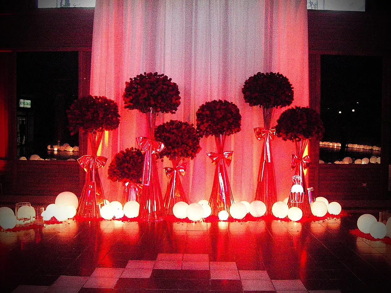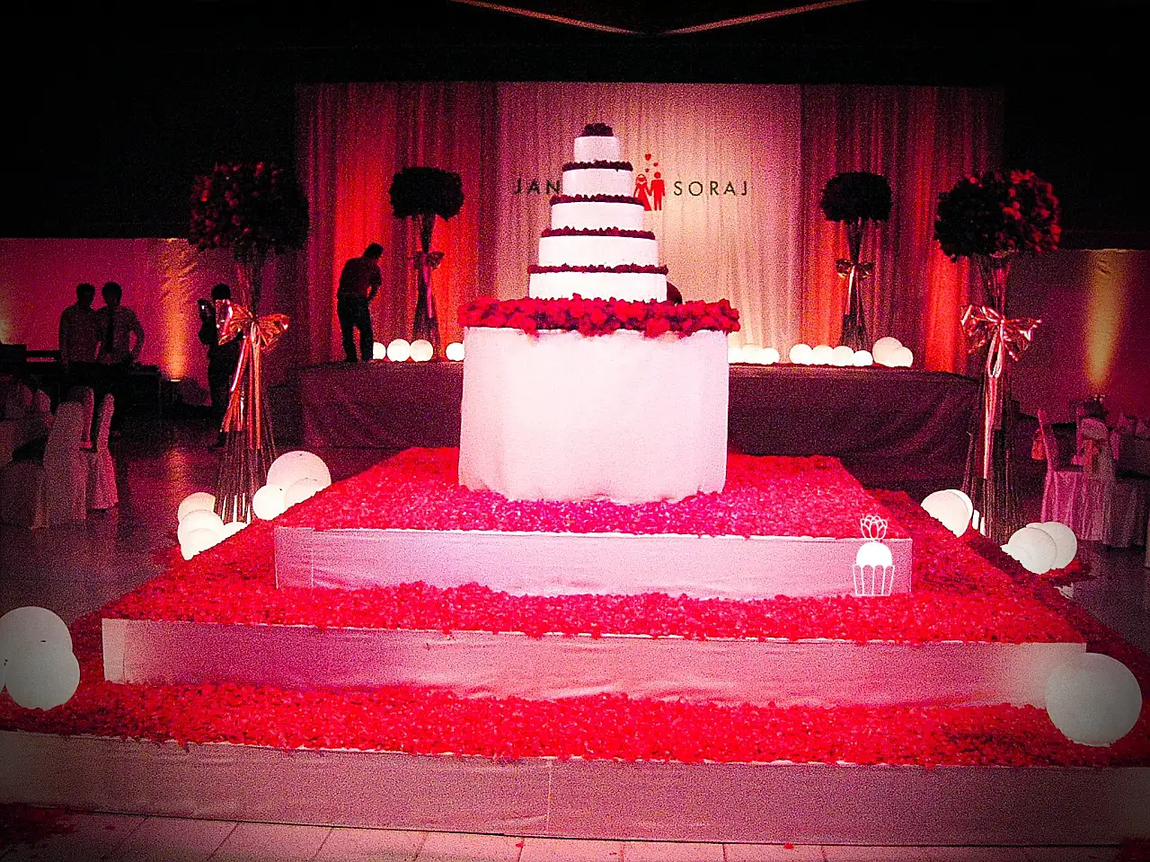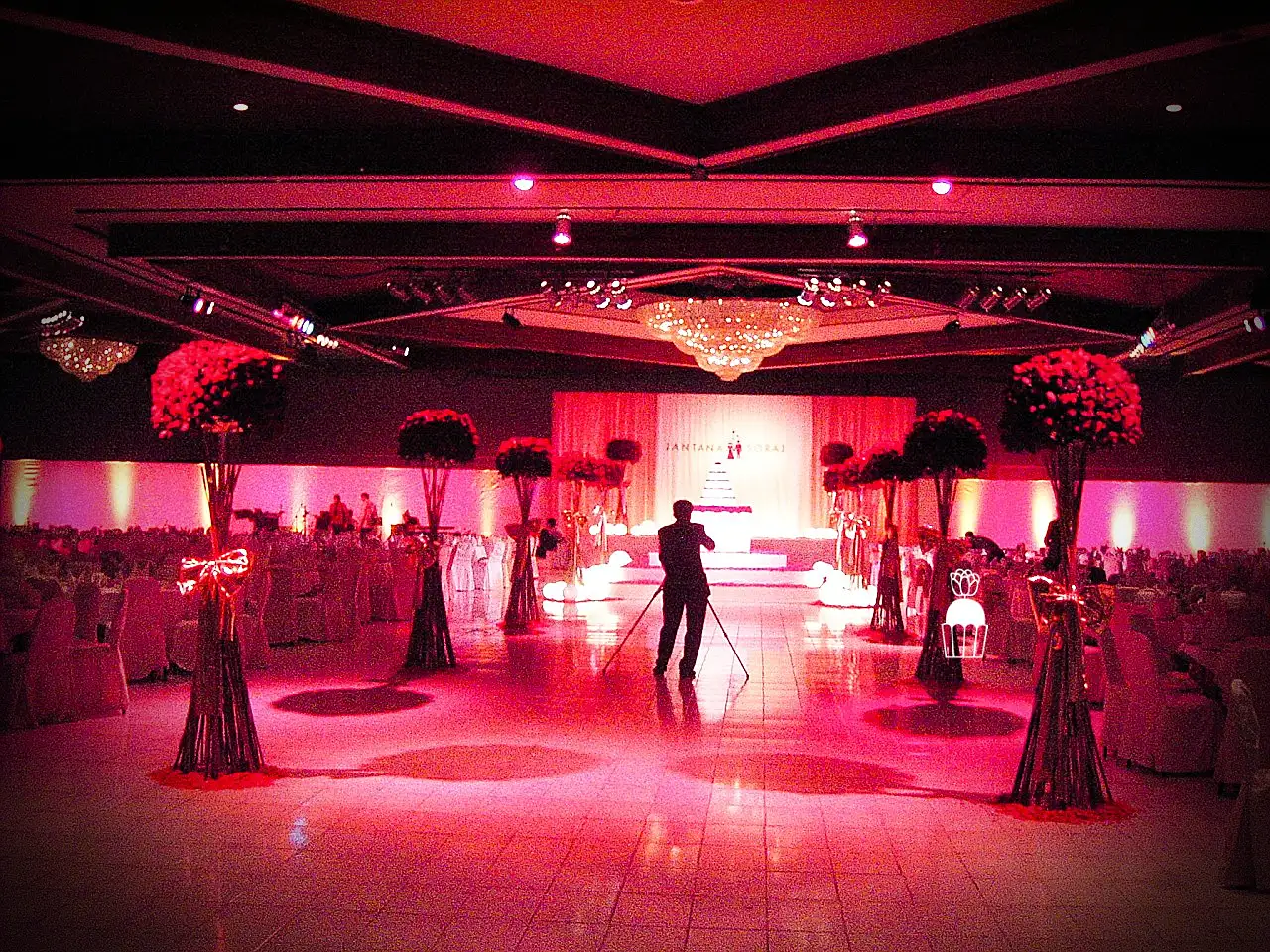 A wedding fully styled with red roses, enhanced by red lighting to create a bold, romantic, and memorable atmosphere.