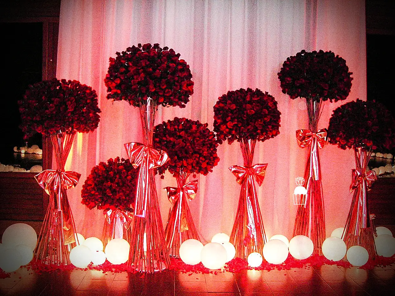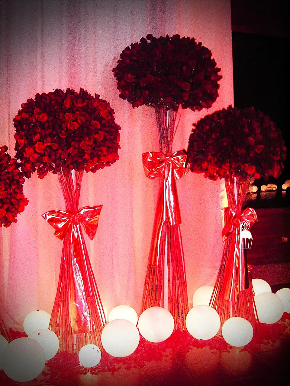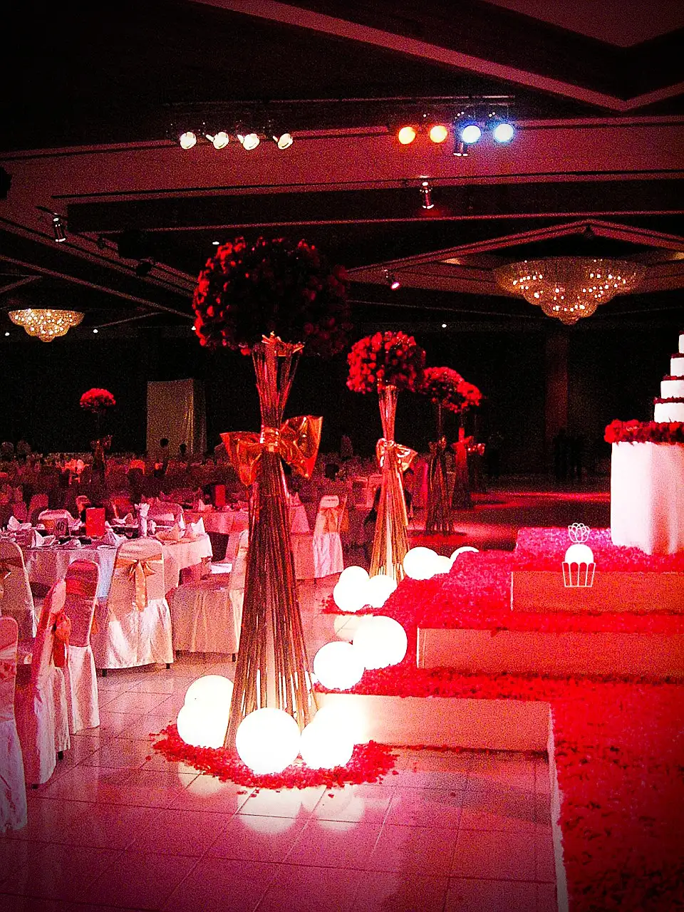 A wedding fully styled with red roses, enhanced by red lighting to create a bold, romantic, and memorable atmosphere.